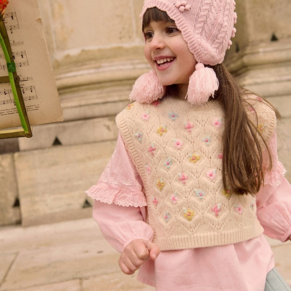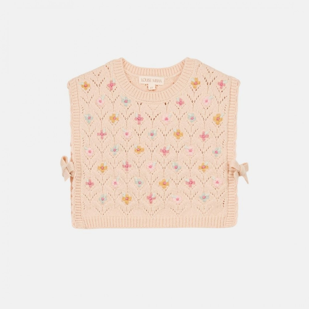 This Louise Misha knit is both delicate and comfortable. Ideal over a blouse, so your child's arms are not too tight (difficult to wear a sweater over a blouse without feeling cramped!). This sleeveless knit is adorned with decorative stitches and openwork details. The colorful floral embroidery is handmade all-over, except on the back. The small ties on the sides allow you to tie the sweater nicely. We love the detail of the hand-crocheted scalloped finishes on the sides.