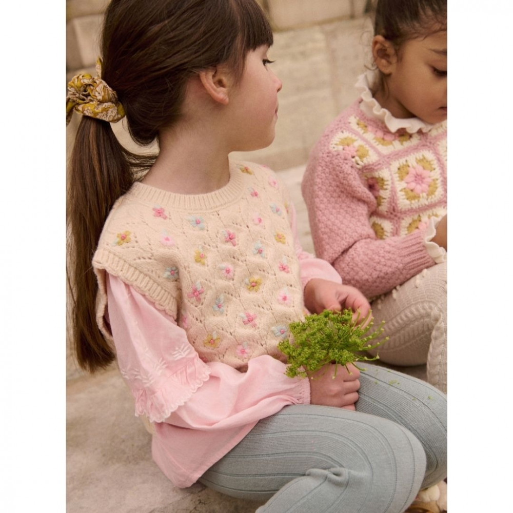 This Louise Misha knit is both delicate and comfortable. Ideal over a blouse, so your child's arms are not too tight (difficult to wear a sweater over a blouse without feeling cramped!). This sleeveless knit is adorned with decorative stitches and openwork details. The colorful floral embroidery is handmade all-over, except on the back. The small ties on the sides allow you to tie the sweater nicely. We love the detail of the hand-crocheted scalloped finishes on the sides.