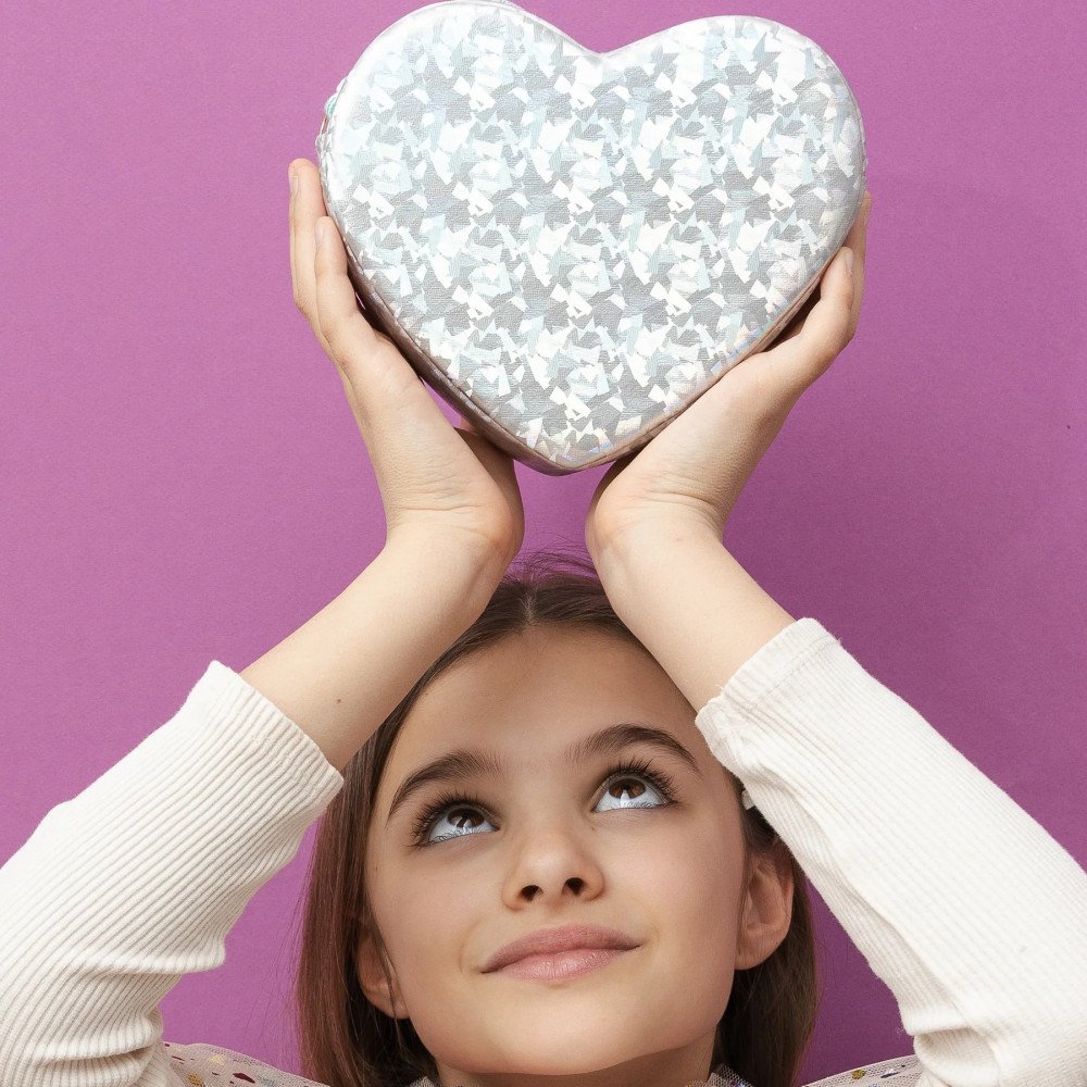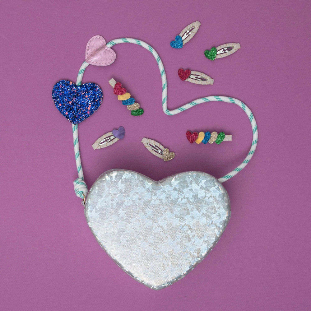 Spread a little love with our Holographic heart bag! The ideal accessory for making any outfit a little more fabulous! Crafted from holographic fabric with a zip top closure Bag measures approx: W 16cm x D 5.5cm x H 13cm Bungee style strap featuring glitter and metallic heart charms - drop length approx 48cm Adjustable Strap - watch our 'How to' here Please note clips are not included Warning! Not suitable for children under 36 months