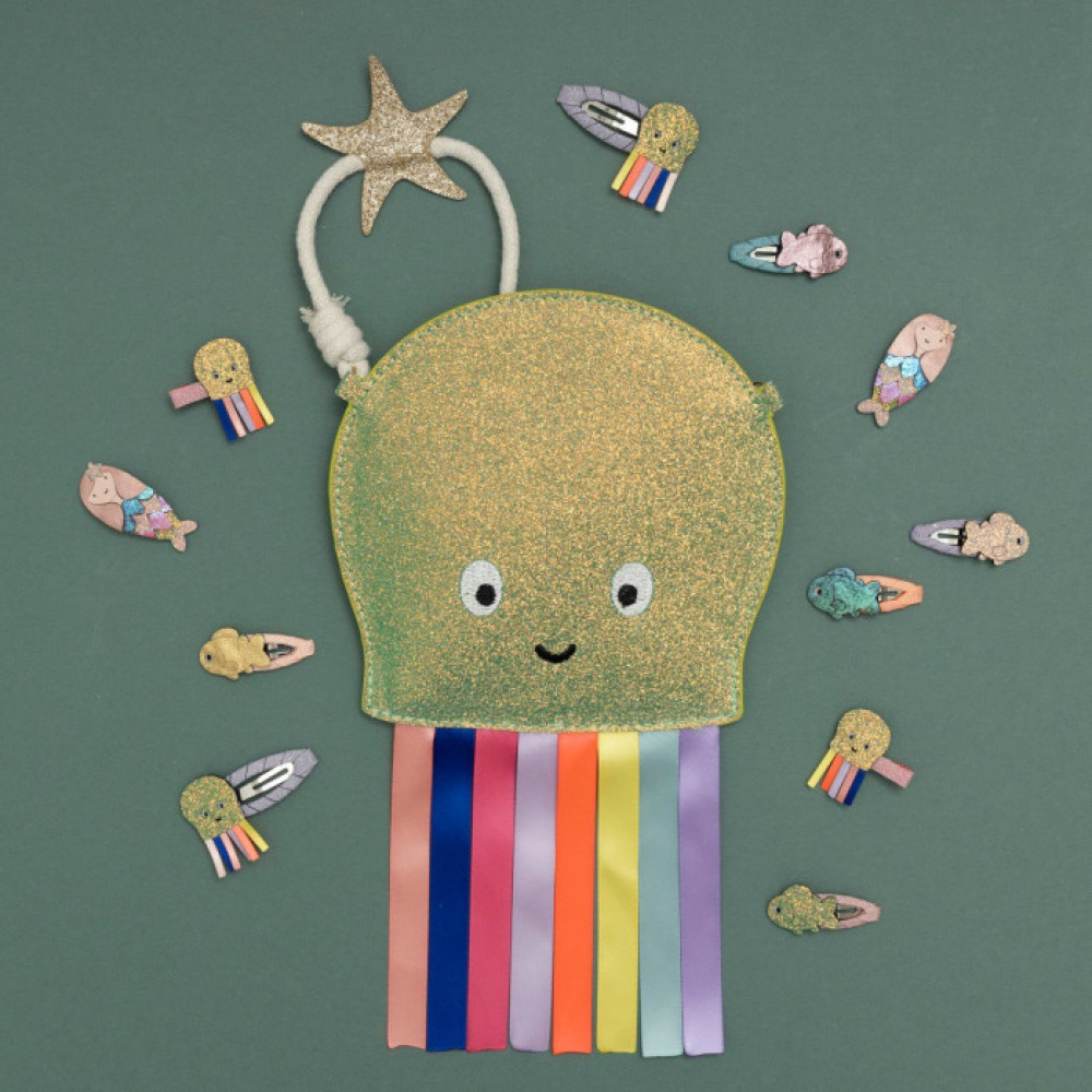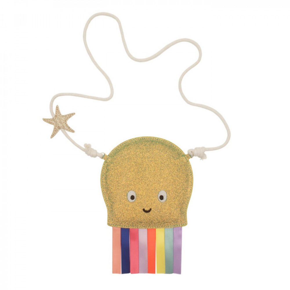 Crafted from fine gold glitter fabric with eight beautifully bright satin ribbon tentacles and sweet embroidered face Zip pocket. Rope style cross body strap featuring a padded gold glitter starfish - strap drop length approx 48cm. Adjustable Strap. Bag measures W 17cm x D 1cm x H 29cm Wipe clean only. Measures approx 25cm W x 1cm D x 22cm H Bungee style strap featuring pink glitter fabric star charm - drop length approx 48cm. Adjustable Strap. Wipe clean only.