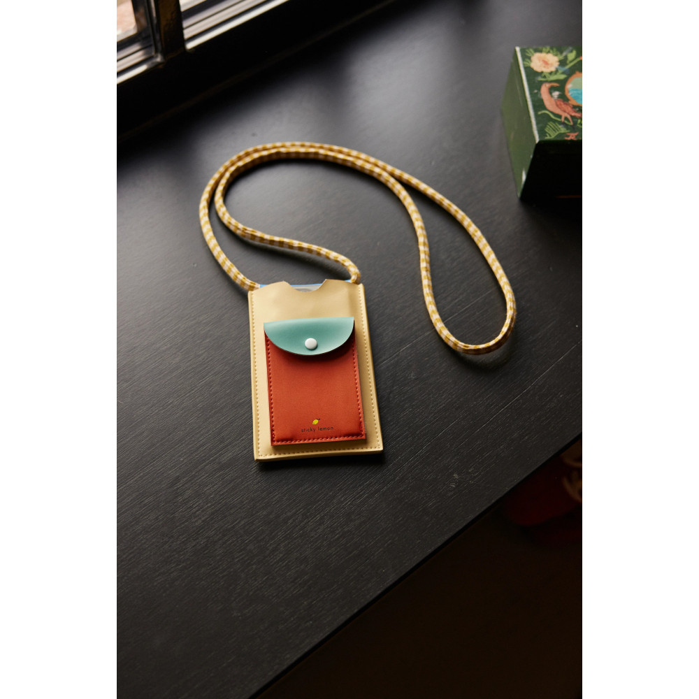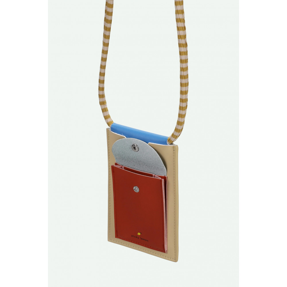 Keep your phone and small essentials close by, all while being fashionable at the same time. The phone pouch has space for three cards in the back and a small pocket on the front with that closes with a magnet button. – body - 9 x 15,5 cm – front pocket - 7 x 10 cm – strap - 0,8 x 122 cm