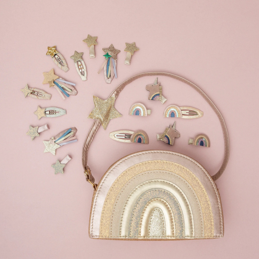 Add some shimmer and shine with our Pink rainbow bag! Crafted from a beautiful blend of pretty pink hues, glitter and sparkles a plenty, this delightful bag is the ideal accessory to compliment any outfit! Crafted from a magical mix of glitter and metallic fabrics Zip top closure Metallic leatherette strap complete with gold glitter star charm Strap drop length approx 48cm Bag measures approx H11.5cm x W17.5cm X D5cm Please note clips are not included Warning! Not suitable for children under 36 months