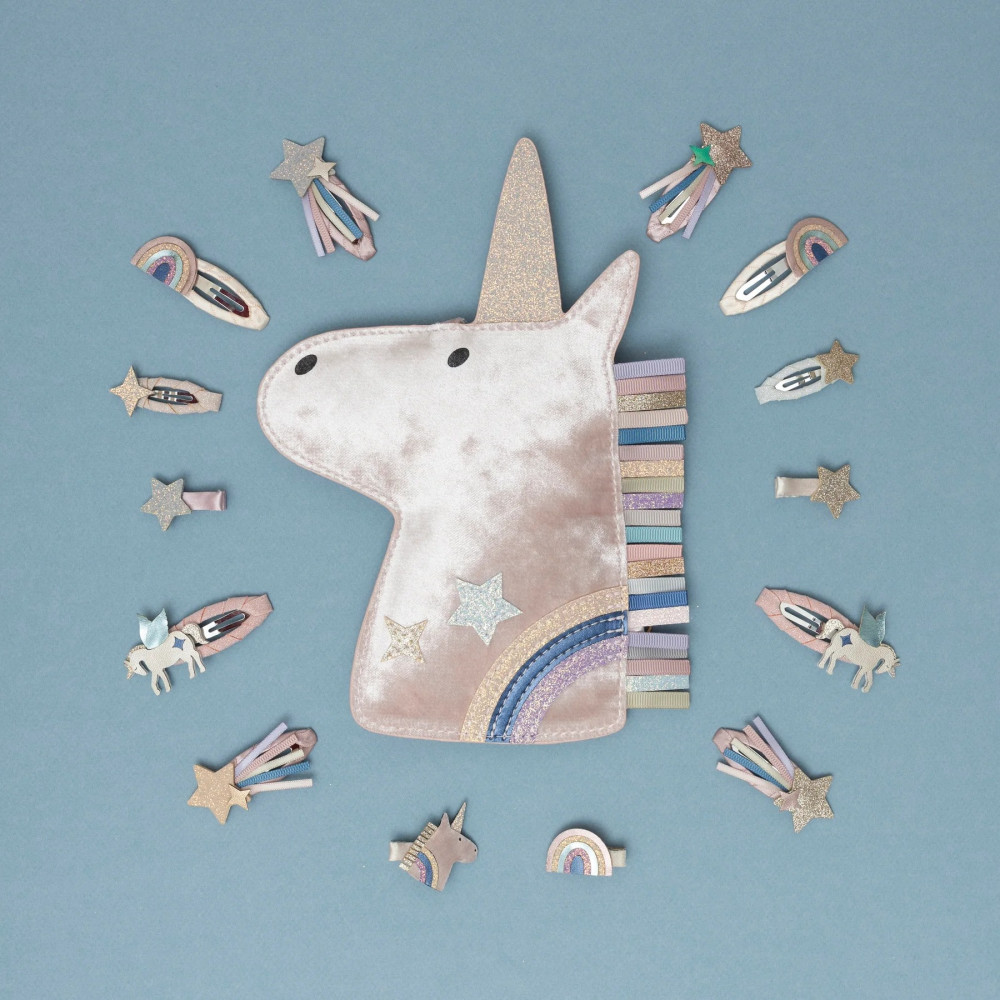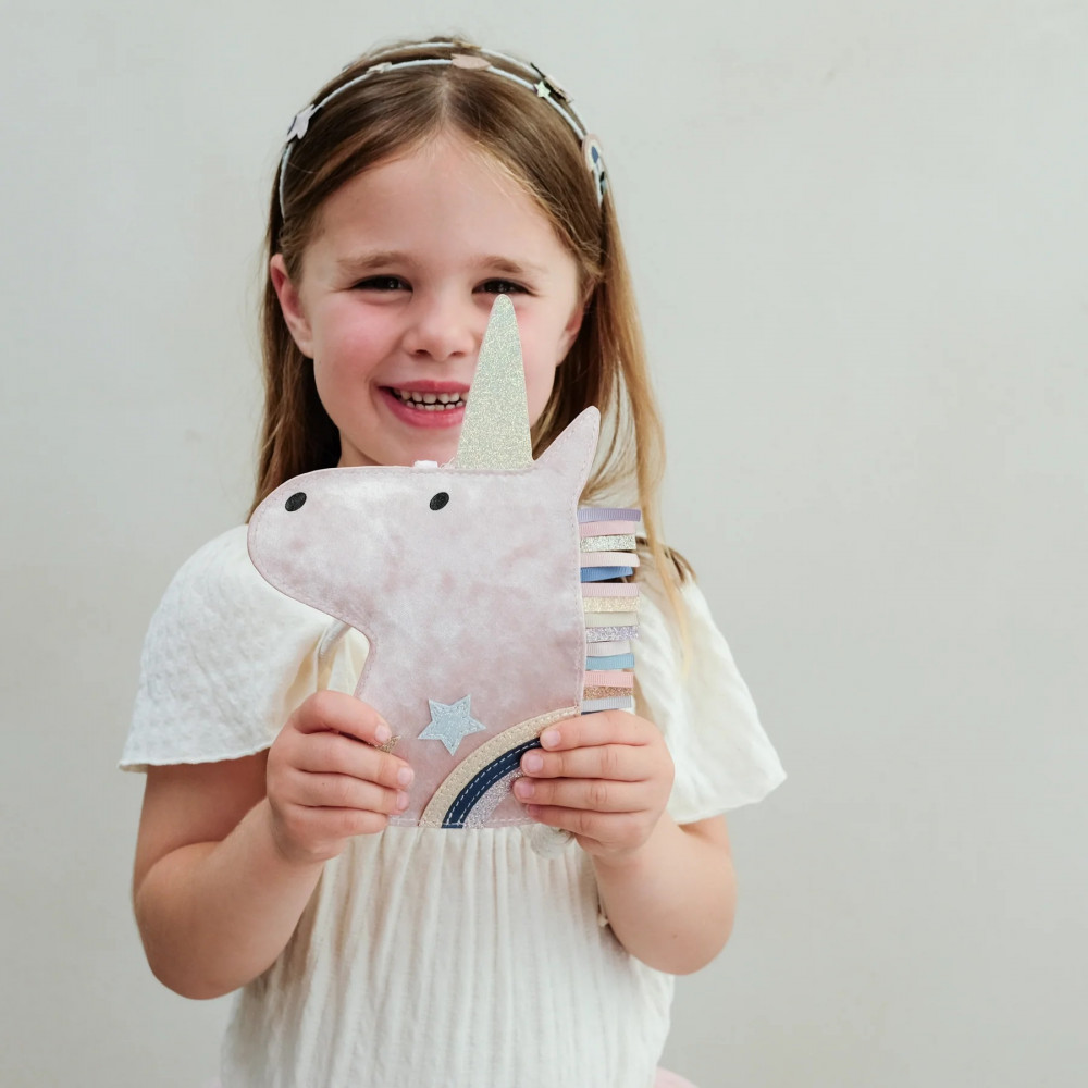 Our bestselling unicorn bag is back - now in a beautifully soft velvet! With a shimmering glitter horn and a pretty pastel rainbow ribbon mane, this bag would make a magical gift for any occasion! Measures approx: W 20cm x D 1cm x H 23cm Bungee cord strap - drop length approx 48cm Crafted from a beautiful combination of soft velvet, glitter and metallic fabrics with multicoloured ribbon 'mane' Adjustable strap - watch our 'How to' here Zip pocket Please note clips are not included Warning! Not suitable for children under 36 months