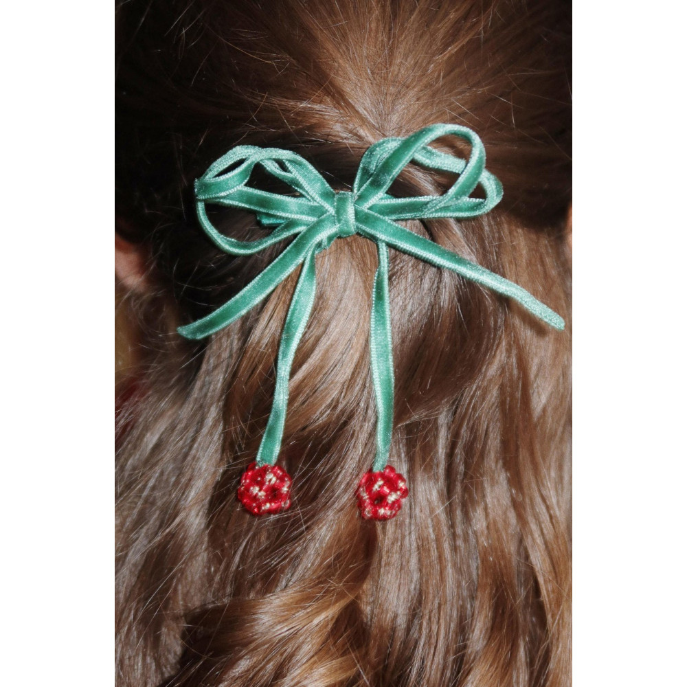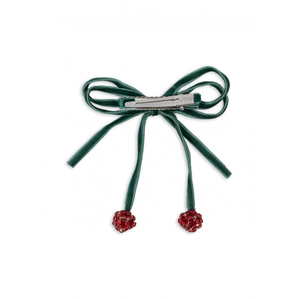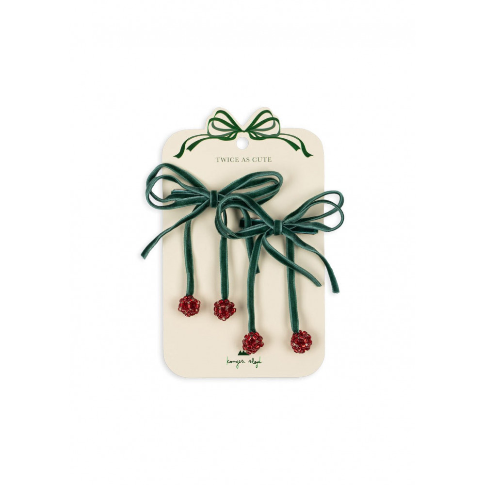 Dress up your little one’s style with the captivating allure of Konges Sløjd Smoke Pine 2 Pack Cherry Bow Hair Clips. These delightful accessories, specially designed for children aged 3 years and older, feature twinkling cherry bows that add a shimmering finish to any outfit. Each bow is meticulously crafted from a blend of glass and polyester, showcasing a polished aesthetic while ensuring durability. Secured by sturdy iron clips, they promise a firm hold that stays put through playdates and school days alike. The lush green hue paired with the playful cherry design not only enhances any hairdo but also injects a fun pop of color. These hair clips are gentle on your child's hair, blending comfort with charm. Easy to attach and remove without tugging, they provide a hassle-free way to accessorize even for the littlest fashion enthusiasts. Whether it's a casual day out or a special occasion, these Konges Sløjd hair clips bring a whimsical touch to your child's wardrobe, ensuring they look adorable while enjoying their activities.