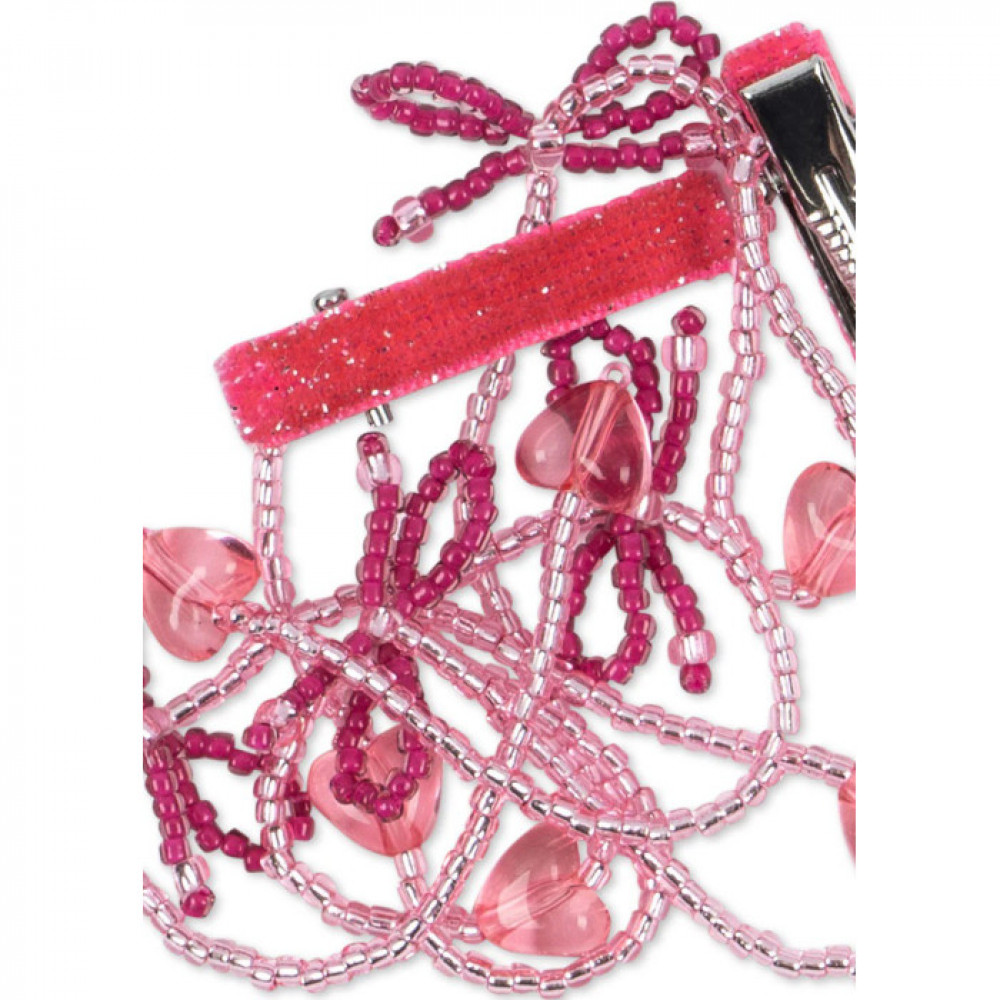 Made with glass beads, acrylic, and polyester and fastens with an iron clip.