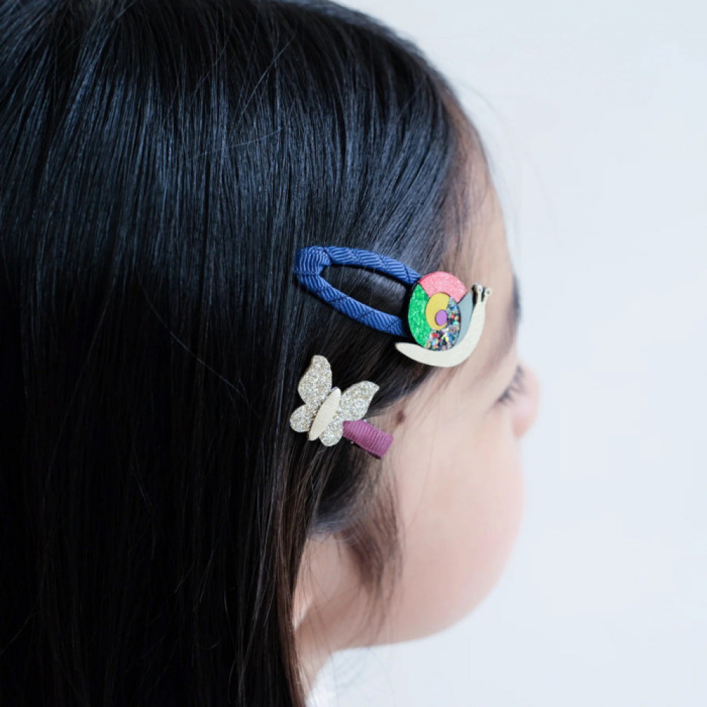 Meet Suzie, the sparkliest of snails! Along with two golden glitter butterflies, this pack is sure to raise a smile! A wonderful out-of-the-ordinary gift idea! 2 x 5cm grosgrain ribbon wrapped clic clac clips 2 x 2.5cm grosgrain ribbon wrapped alligator clips