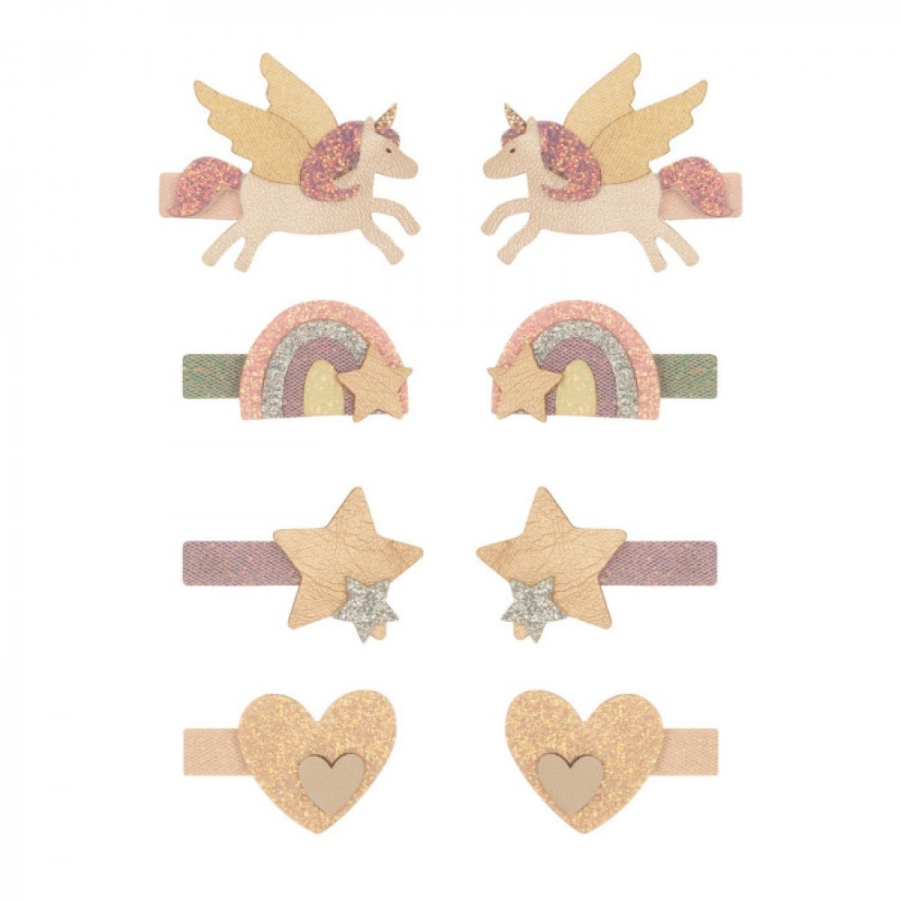 Let their mythical dreams take flight with this super magical mini clip set featuring sparkling unicorns, twinkling rainbows, shimmering stars and golden hearts! 8 in a pack.