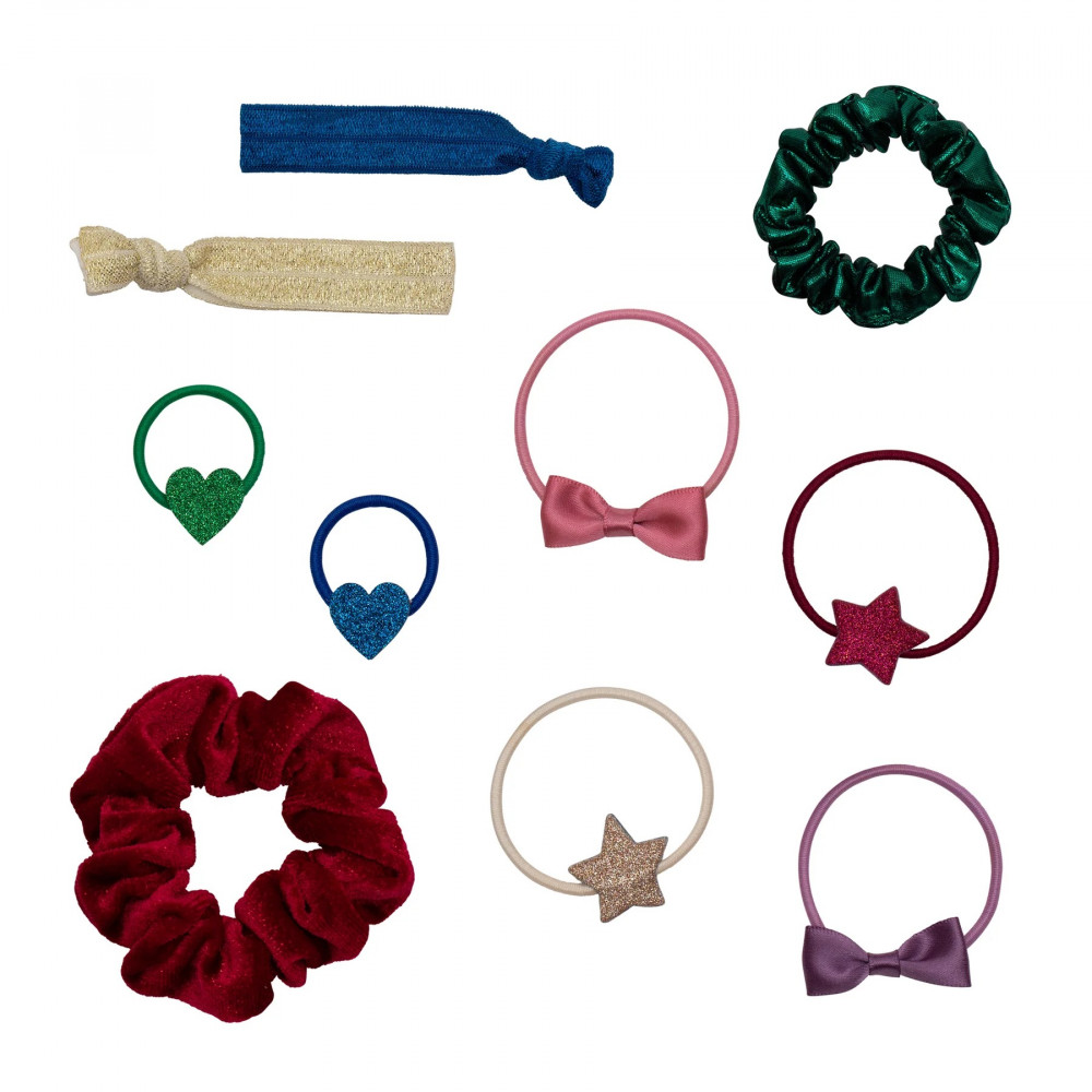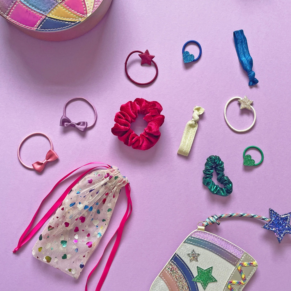 Our brand new Bright sparkle pouch makes a wonderfully colourful gift! Untie the bright pink satin ribbon to reveal an array of ponies and scrunchies in all the colours of the rainbow! Pouch crafted from multicoloured heart print, soft tulle fabric with bright pink satin ribbon tie Pouch measures approx H18cm x W13cm Contains 10 assorted ponies and scrunchies Warning! Not suitable for children under 36 months