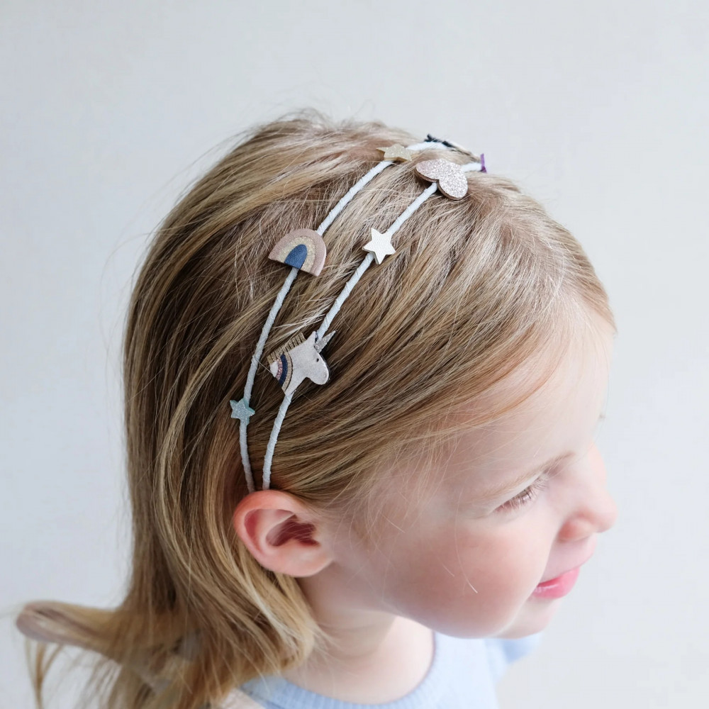 Add some mythical magic to their hair with our Celeste unicorn double alice! Super soft unicorns, rainbows, stars and hearts come together in the prettiest pastel palette for a look they'll love! Alice band sized to fit ages 3-10 years Two pale blue glitter ribbon wrapped rows adorned with unicorns, rainbows, stars and hearts crafted from a pretty mix of soft velvet, glitter and metallic fabrics Warning! Not suitable for children under 36 months