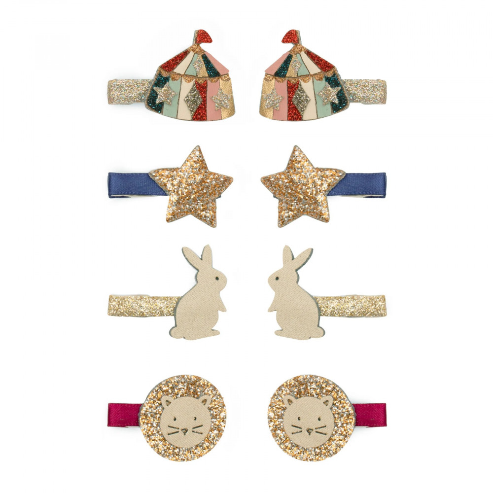 Roll up, roll up and meet our wonderful new Circus mini clips! Intricately crafted from a mesmerising mix of colours and textures, these clips are sure to turns heads wherever they go! 8 in a pack 3cm ribbon wrapped alligator clips Lions, circus tents, rabbits and stars crafted from a mix of glitter, metallic and soft suedette fabrics Warning! Not suitable for children under 36 months
