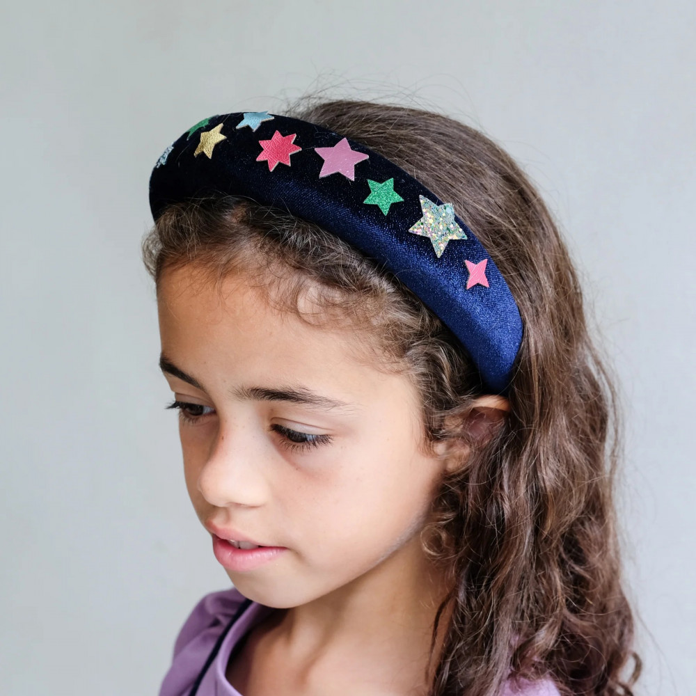 Step out in style with our Constellation alice band! Scattered with a beautiful selection of colourful stars, this soft and sparkly headband will add an effortless finishing touch to any look! 1 in a pack Alice band sized to fit ages 3-10 years Crafted from glitter velvet fabric embellished with a colourful combo of glitter and metallic fabric stars Warning! Not suitable for children under 36 months