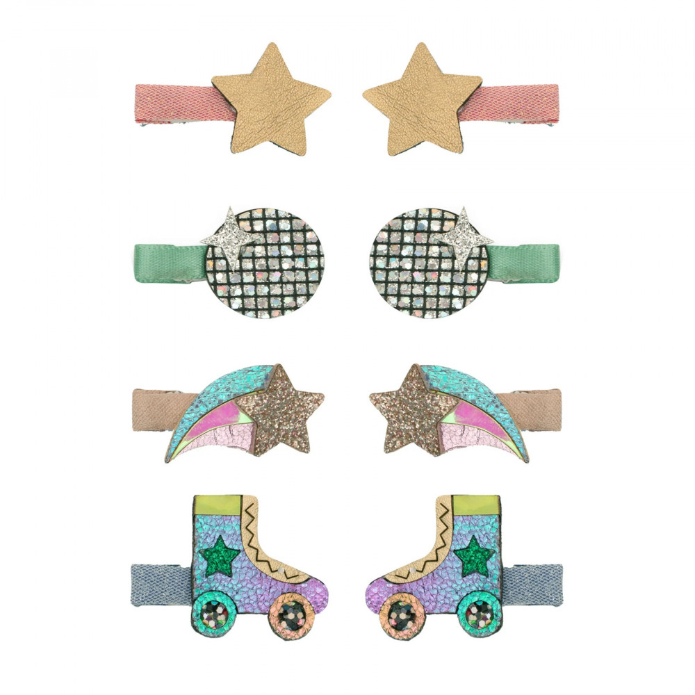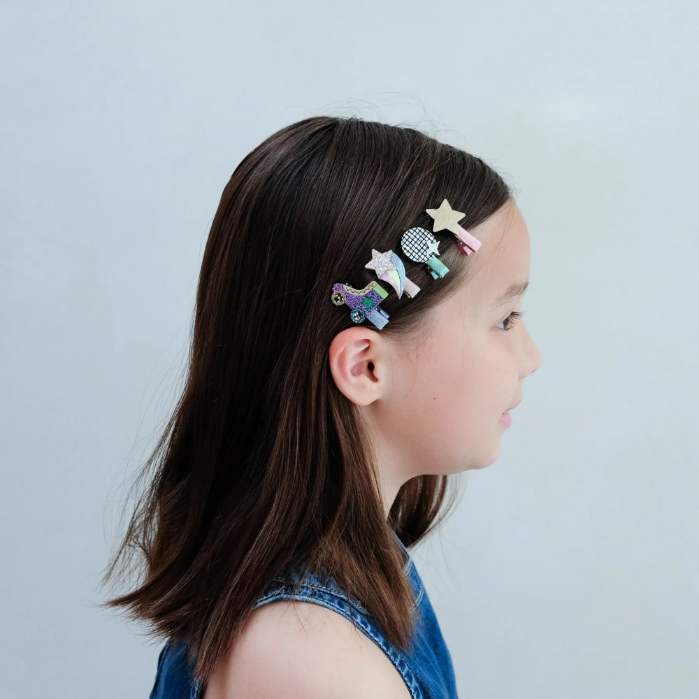 Dinky little disco fans will love to decorate their chosen 'do with this fab pack of mini clips! Disco balls, retro rollerboots, and sparkly stars - all the stuff the cool kids will go crazy for! 8 in a pack 3cm ribbon wrapped alligator clips Boots, disco balls and stars all crafted from a colourful blend of glitter and metallic fabrics Warning! Not suitable for children under 36 months