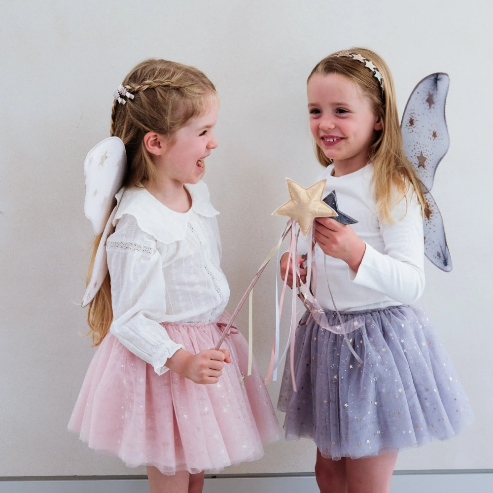 This sparkling headband twinkles like a shooting star, making it perfect for playful days and special occasions alike. Lightweight and comfortable, it keeps hair neatly in place while adding a fun, celestial sparkle to your look. Ribbon wrapped alice band to fit ages 3-10 years Features soft padded stars crafted in glitter fabric Warning! Not suitable for children under 36 months