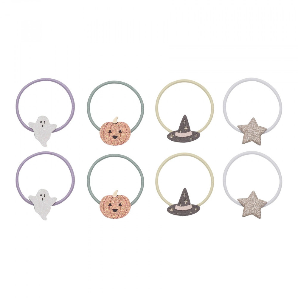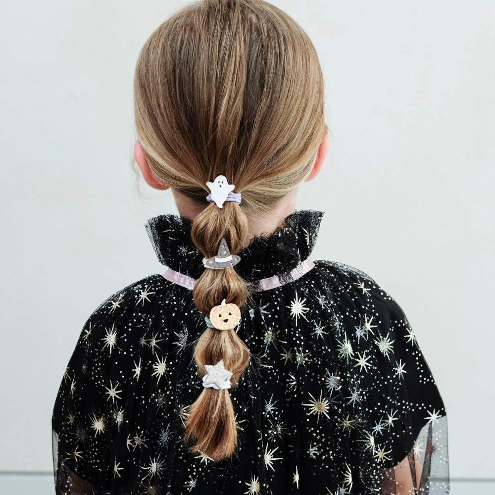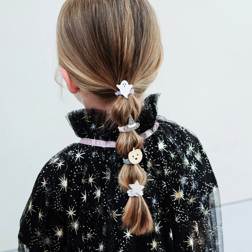 This sparkly eight pack of ponies are perfect for creating all kinds of spooky styles! Crafted from soft glitter fabrics and secured to pretty pastel elastics, these are just the right mix of frightful and delightful! 8 in a pack 5cm stretchy and strong elastics in contrasting pretty pastel shades Ghosts, pumpkins, hats and stars all crafted from a mix of soft suedette and glitter fabrics Warning! Not suitable for children under 36 months