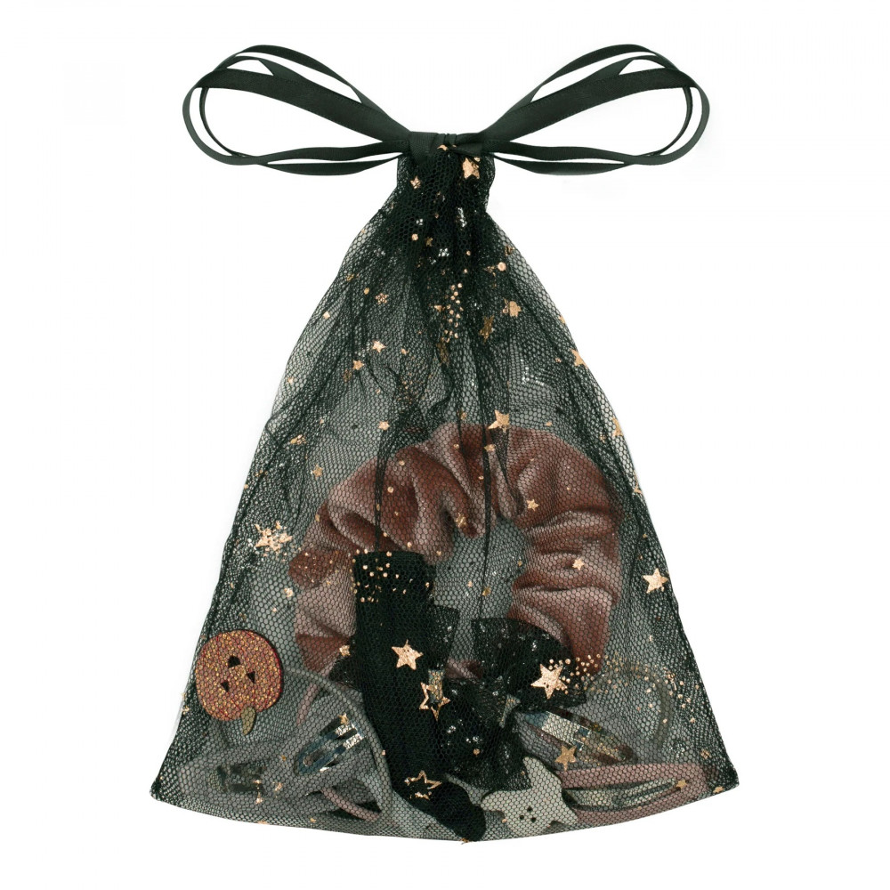 This star-speckled tulle Halloween pouch hides a hauntingly good selection of hair treats! A perfect mix of sweet and spooky for boo-tiful hair this Halloween! Pouch crafted from layers of star speckled, soft tulle black fabric with satin ribbon tie Pouch measures approx H18cm x W13cm Contains three full size ponies, two mini ponies, one velvet scrunchie, and four clic clac clips Warning! Not suitable for children under 36 months