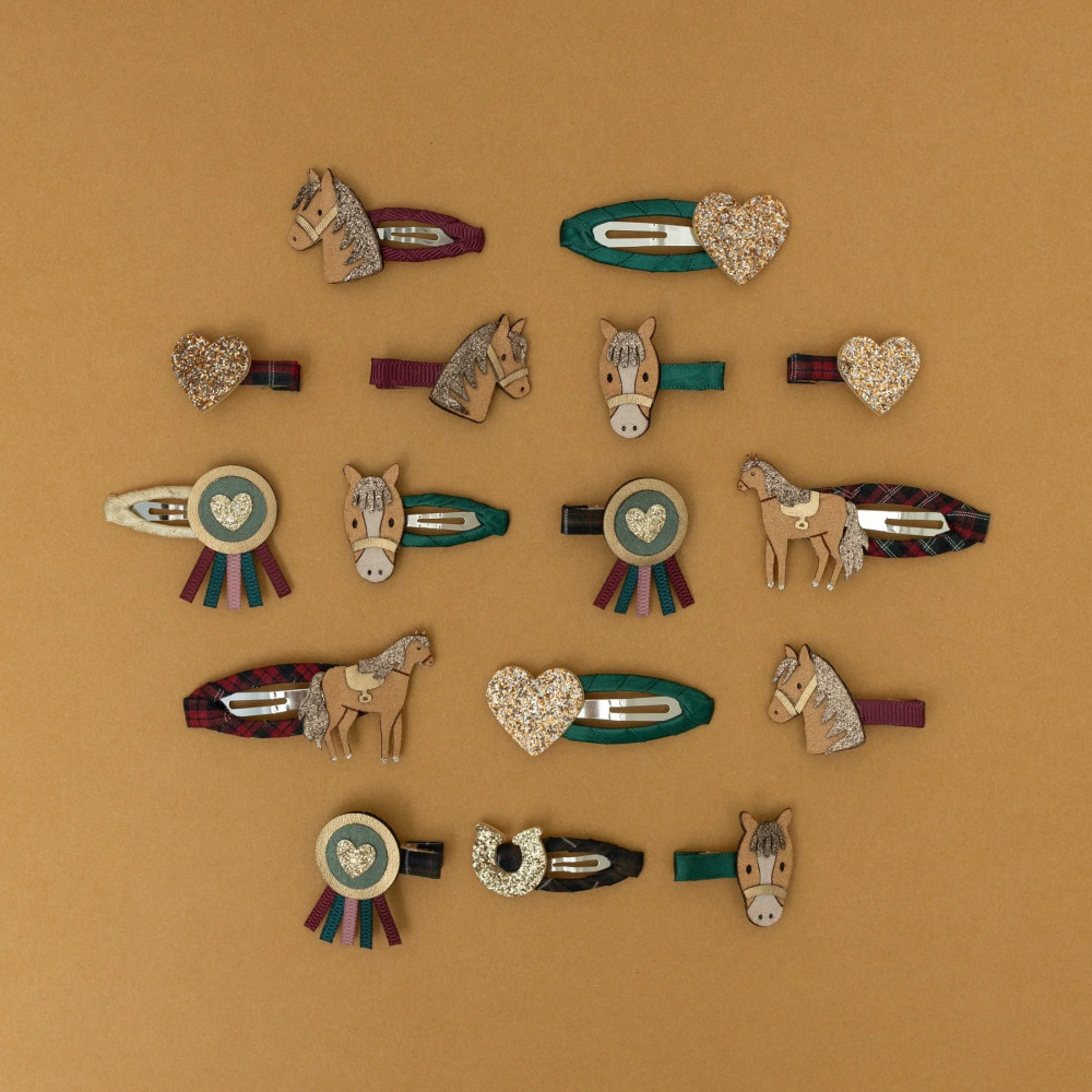Tidy their tresses with this super sweet pack of mini clips! Ideal for little pony fans who love to gallop through their day in style. 5 in a pack 4cm ribbon wrapped clic clac clips Ponies, rosette, heart and horseshoe crafted from a mix of suedette, glitter and metallic fabrics with grosgrain ribbon tails Warning! Not suitable for children under 36 months