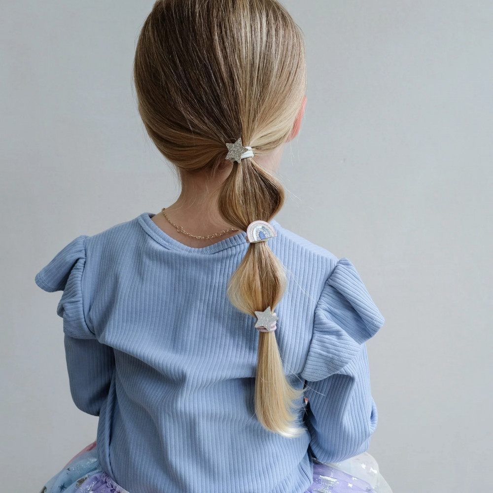 Sparkle and shine with our Rainbow & star pony pack featuring four twinkling stars plus two radiant little rainbows in the prettiest palette! 6 in a pack 5cm strong and stretchy elastics adorned with rainbows and stars carefully crafted from soft metallic and sparkling glitter fabrics Warning! Not suitable for children under 36 months