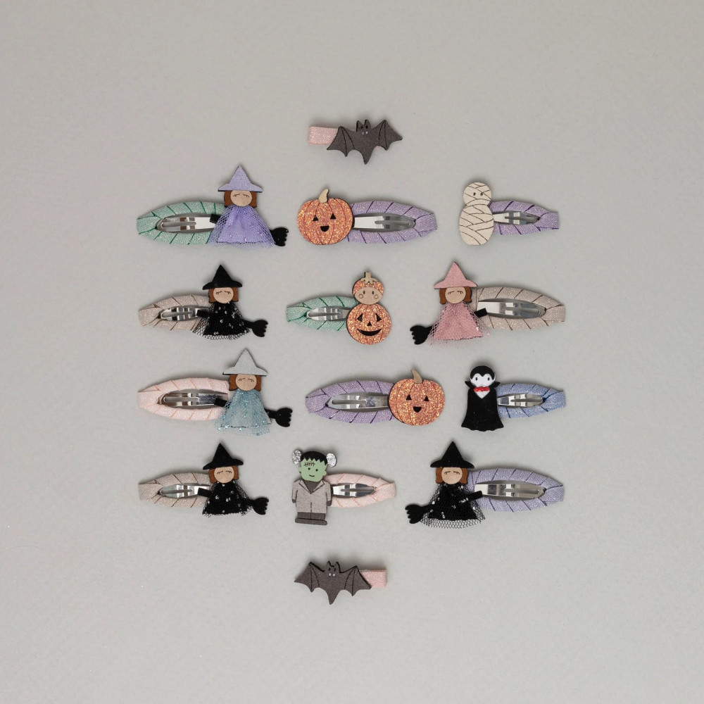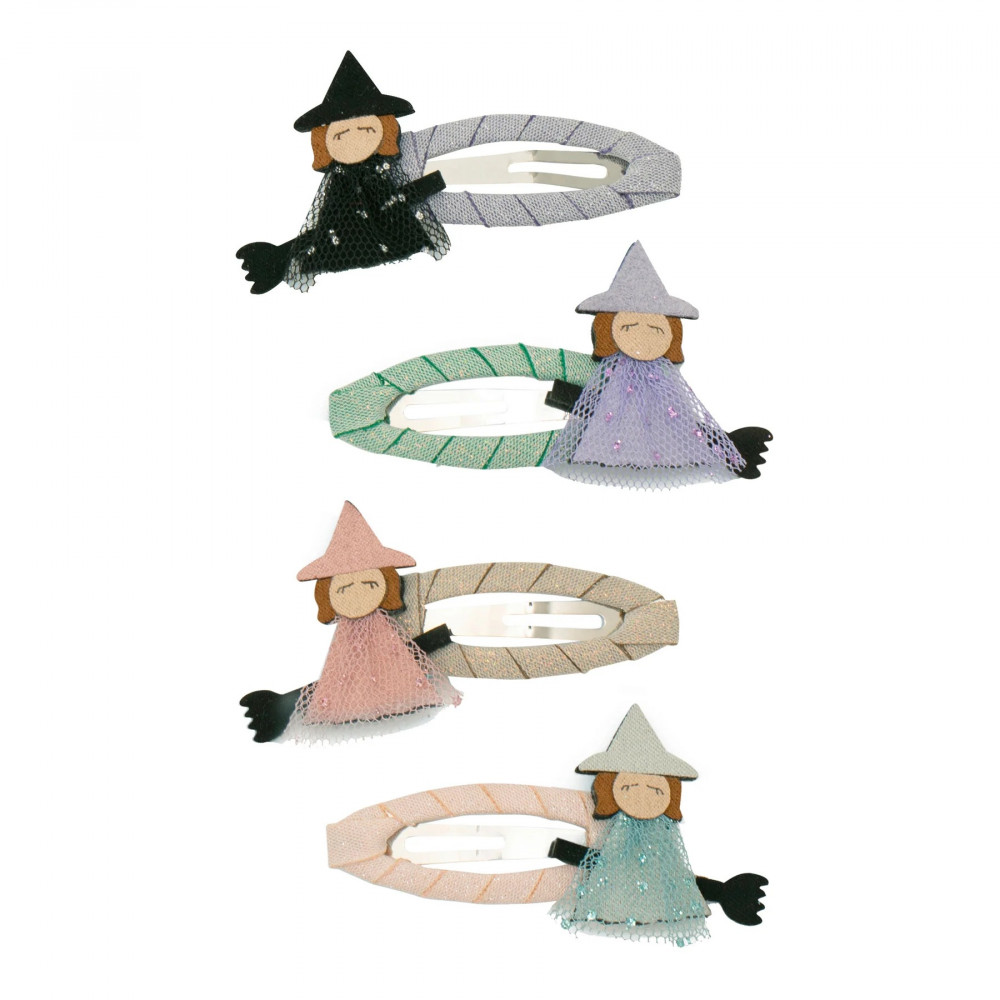 Little ones will just love this colourful collection of witches! Complete with pointed hats, tulle capes and tiny broomsticks, these are perfect for adding some Halloween fun to their hair! 4 in a pack 5cm glitter ribbon wrapped clic clac clips in contrasting colours Witches crafted from a mix of soft suedette fabrics with glitter speckled soft tulle capes Warning! Not suitable for children under 36 months