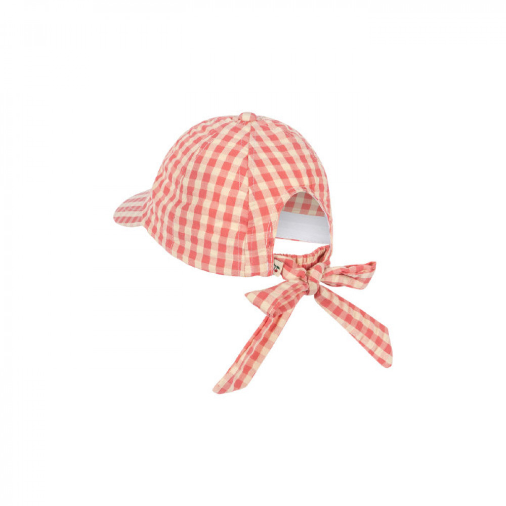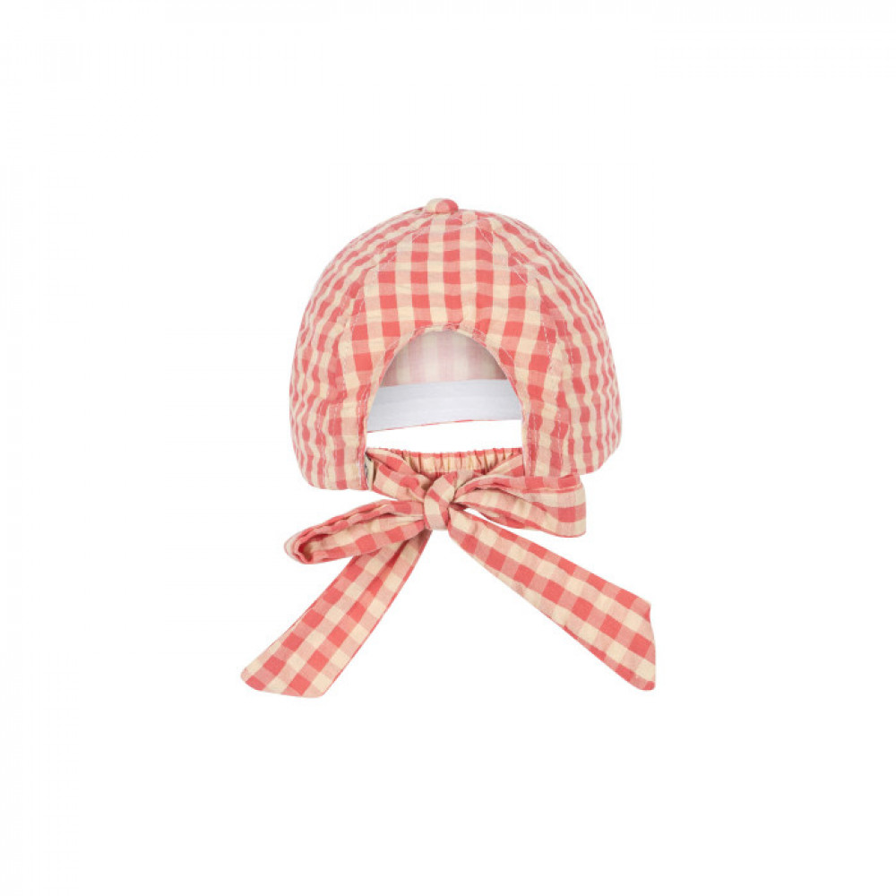 Konges Sløjd pink gingham cap made from seersucker organic cotton. It has a darling soft bow to fasten at the back.