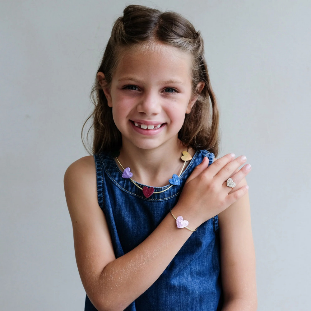 A fabulous new jewellery set for the new season! This beautifully bright and colourful trio is sure to be a hit! A wonderful gift idea for all occasions. Set includes one necklace, bracelet and a ring featuring fabric hearts crafted from a mix of glitter and matt metallics Sized to fit ages 3-10 years Warning! Not suitable for children under 36 months