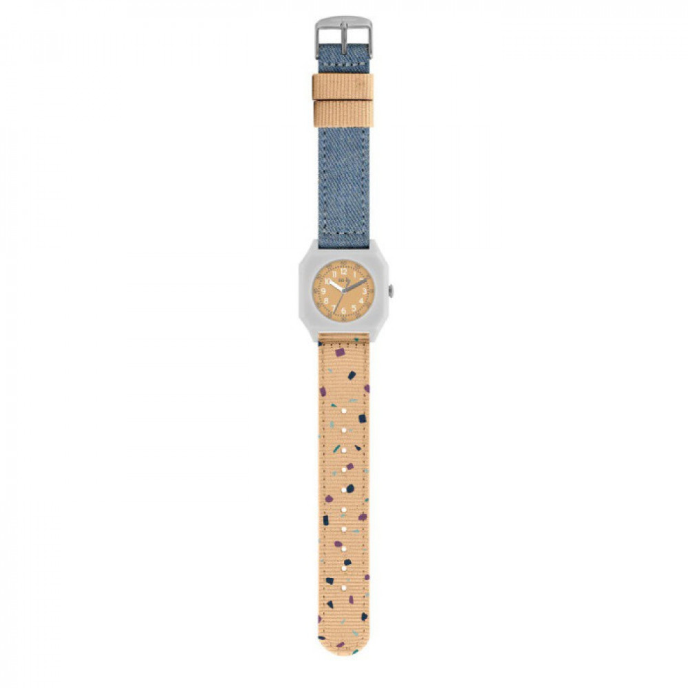 Crystal : mineral glass. Case : recycled nylon. Water resistance : 3 atm - rain or accidental splash resistant (do not use under shower or bathing). Band : nato strap made of recycled nylon and denim with strong steel buckle, machine washable up to 40°C.