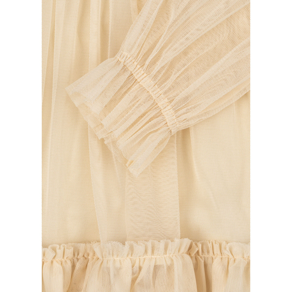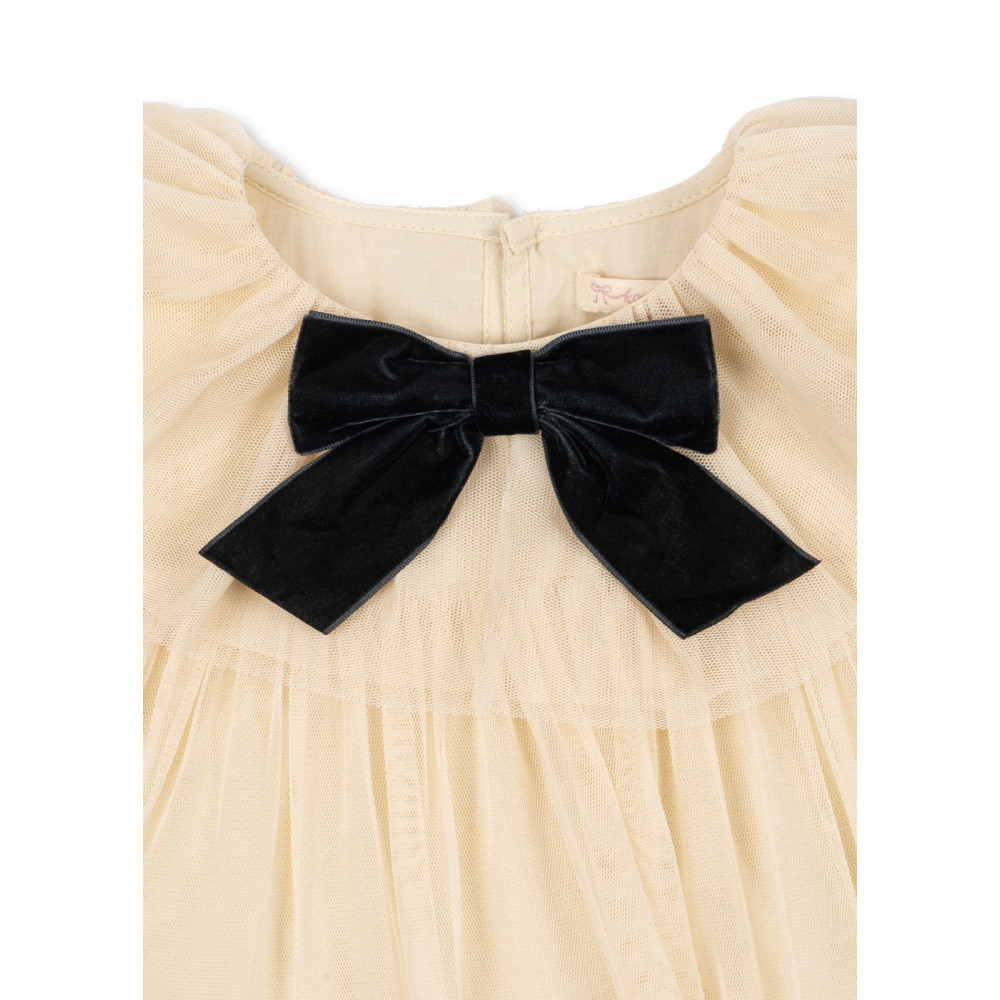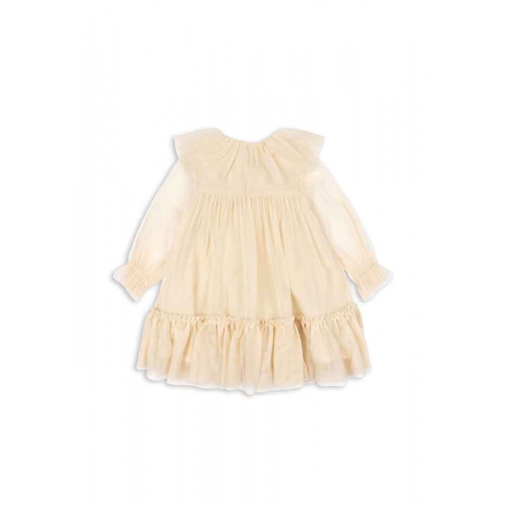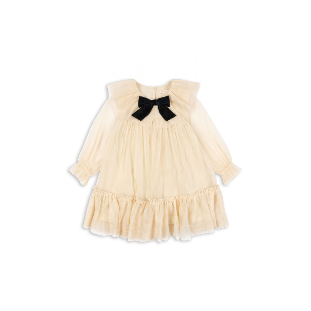 Soft tulle dress with a collar and a decorative bow in front. Designed with a long, loose fit that is comfortable to wear and a soft cotton lining.
