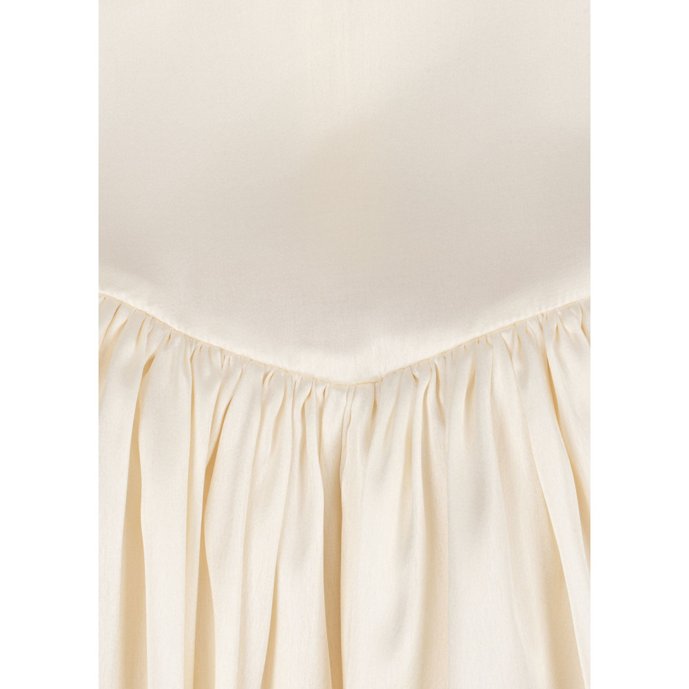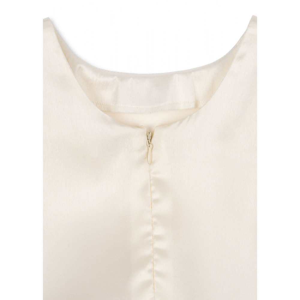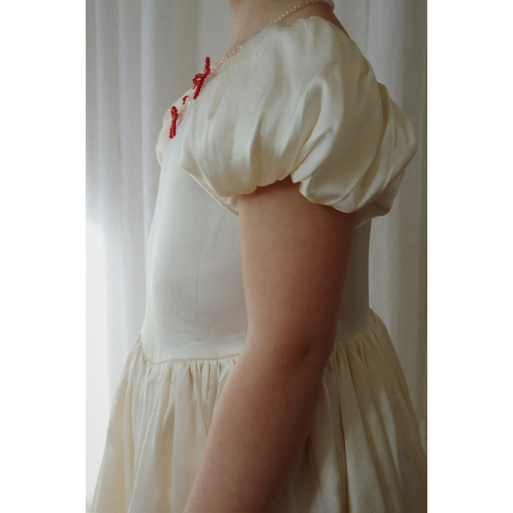 Delicate ivory dress for a girl with voluminous lantern sleeves. Light, airy, with a classic silhouette and a button fastening at the back. Decorated with red bows for an accent.