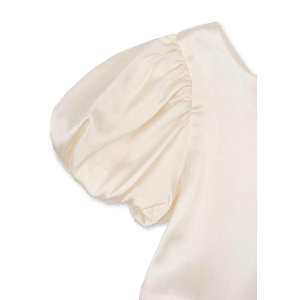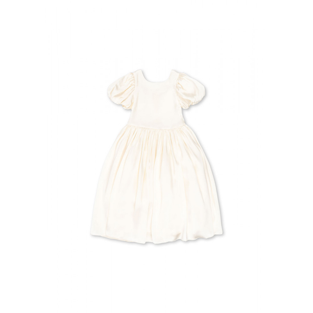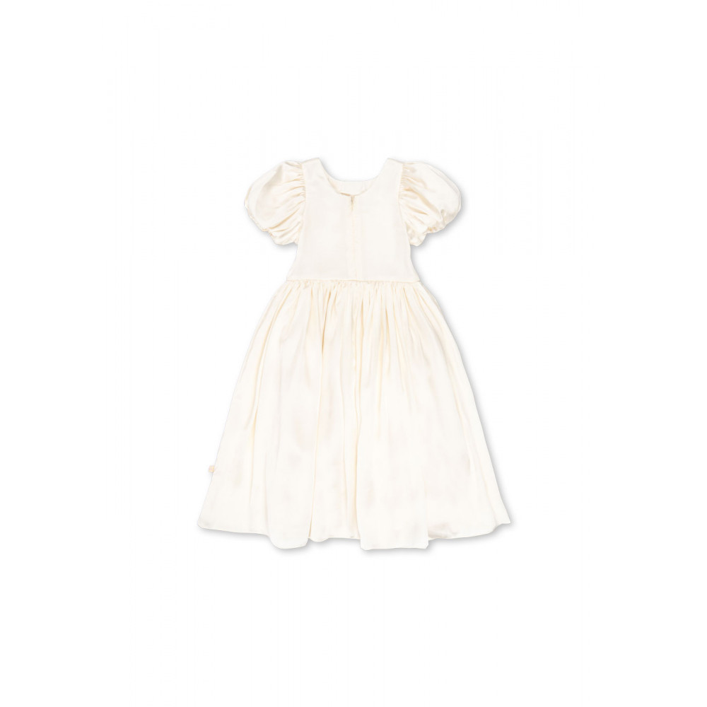 Delicate ivory dress for a girl with voluminous lantern sleeves. Light, airy, with a classic silhouette and a button fastening at the back. Decorated with red bows for an accent.