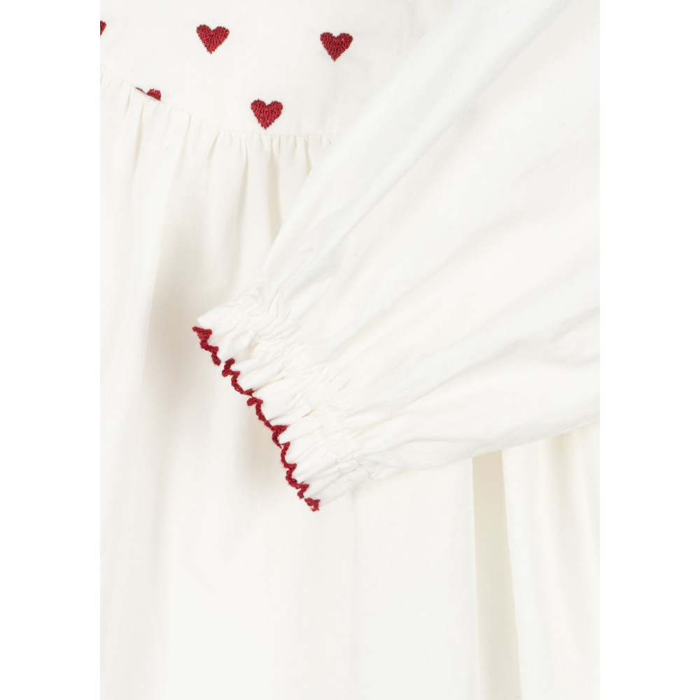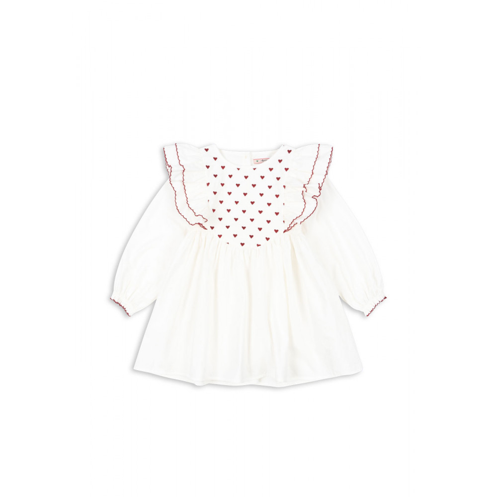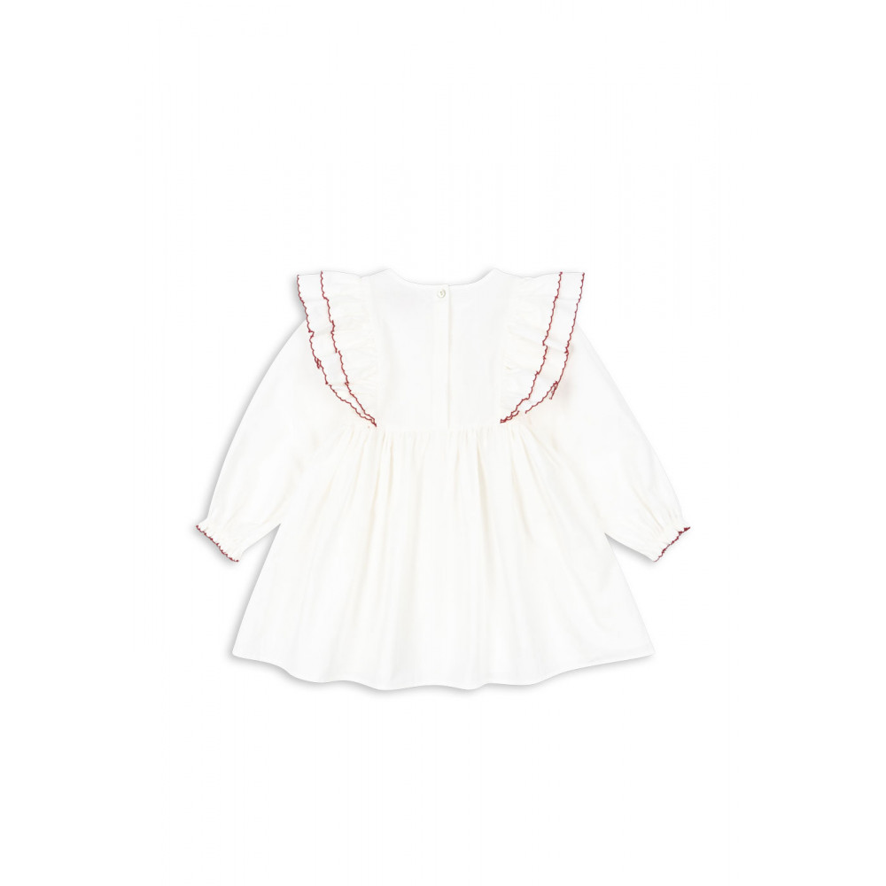 Woven cotton dress with frill details at shoulders and a flared skirt. Closes in the back with buttons.