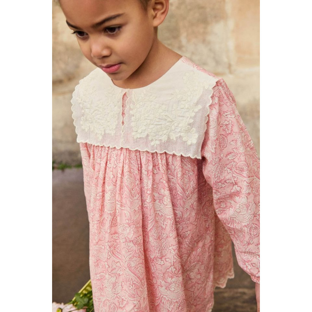 Love of detail: floral dress in cotton batiste, with large square embroidered collar. Collar with two overlapping fabrics: the outline of the upper fabric is embroidered with a treadle embroidery machine, then hand-cut to reveal the outline of the lower fabric. Long sleeves with elasticated cuffs. Long sleeves with elasticated cuffs. Embroidered and scalloped finishing at the bottom of the dress. Button placket at the back. Please note: for sizes under 3, the back is buttoned from top to bottom. Lined.