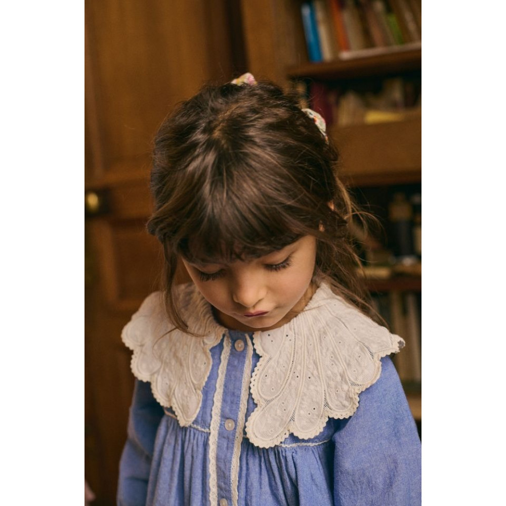 Cotton chambray dress Tone-on-tone eyelet embroidery petal-style collar with lace edges. Front slit with drawstrings. Lace overlay on front center. Shirt cuffs with contrasting embroidery. Smocked and embroidered details at the back.