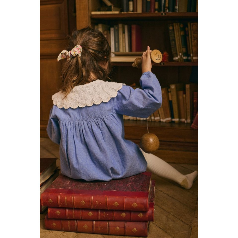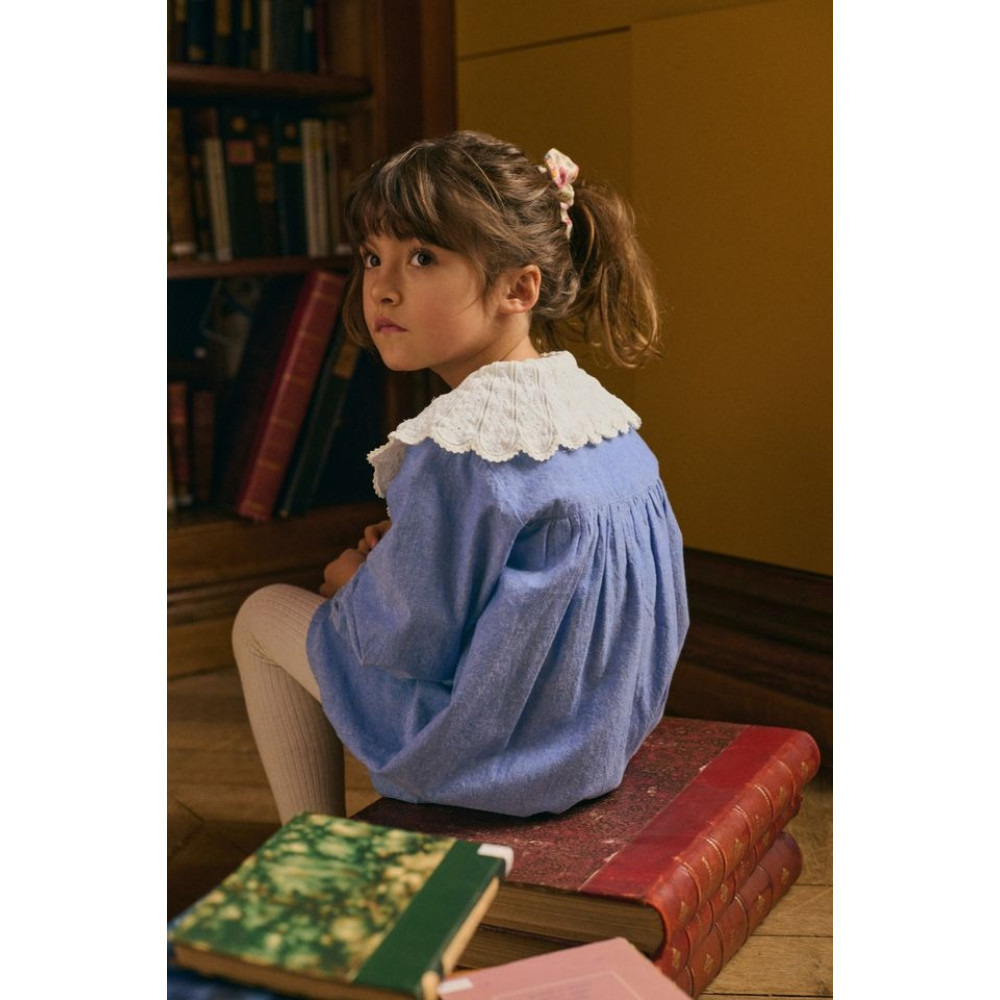 Cotton chambray dress Tone-on-tone eyelet embroidery petal-style collar with lace edges. Front slit with drawstrings. Lace overlay on front center. Shirt cuffs with contrasting embroidery. Smocked and embroidered details at the back.