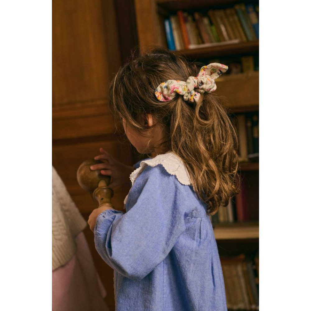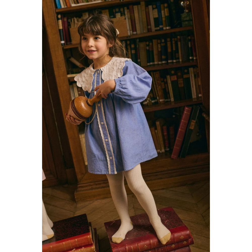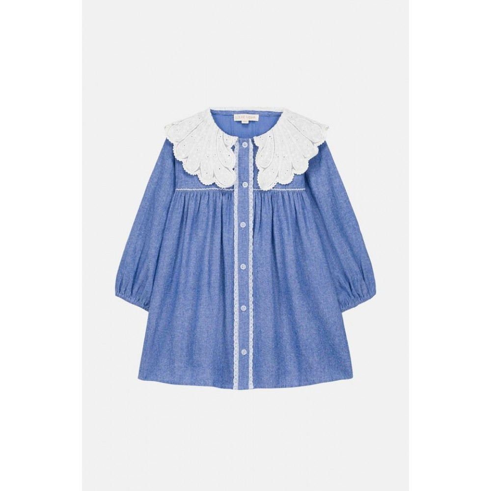 Cotton chambray dress Tone-on-tone eyelet embroidery petal-style collar with lace edges. Front slit with drawstrings. Lace overlay on front center. Shirt cuffs with contrasting embroidery. Smocked and embroidered details at the back.