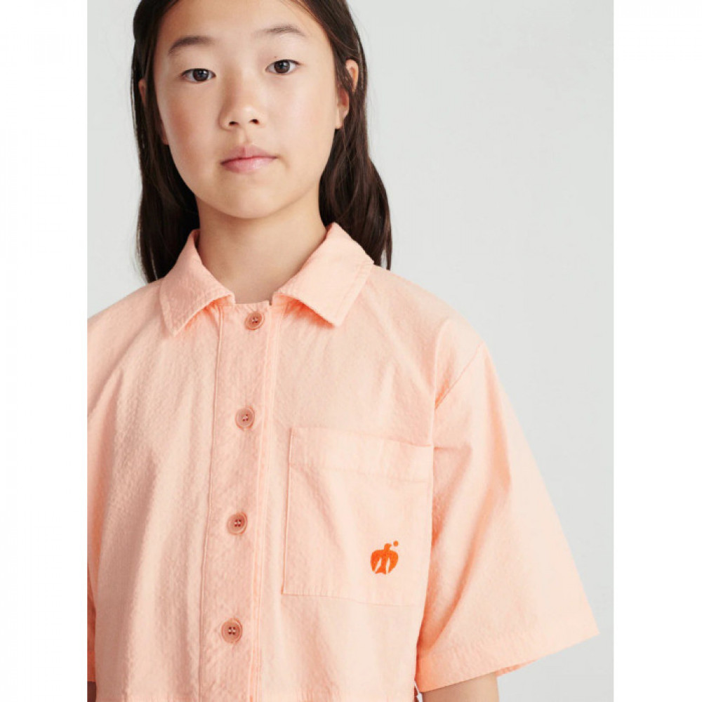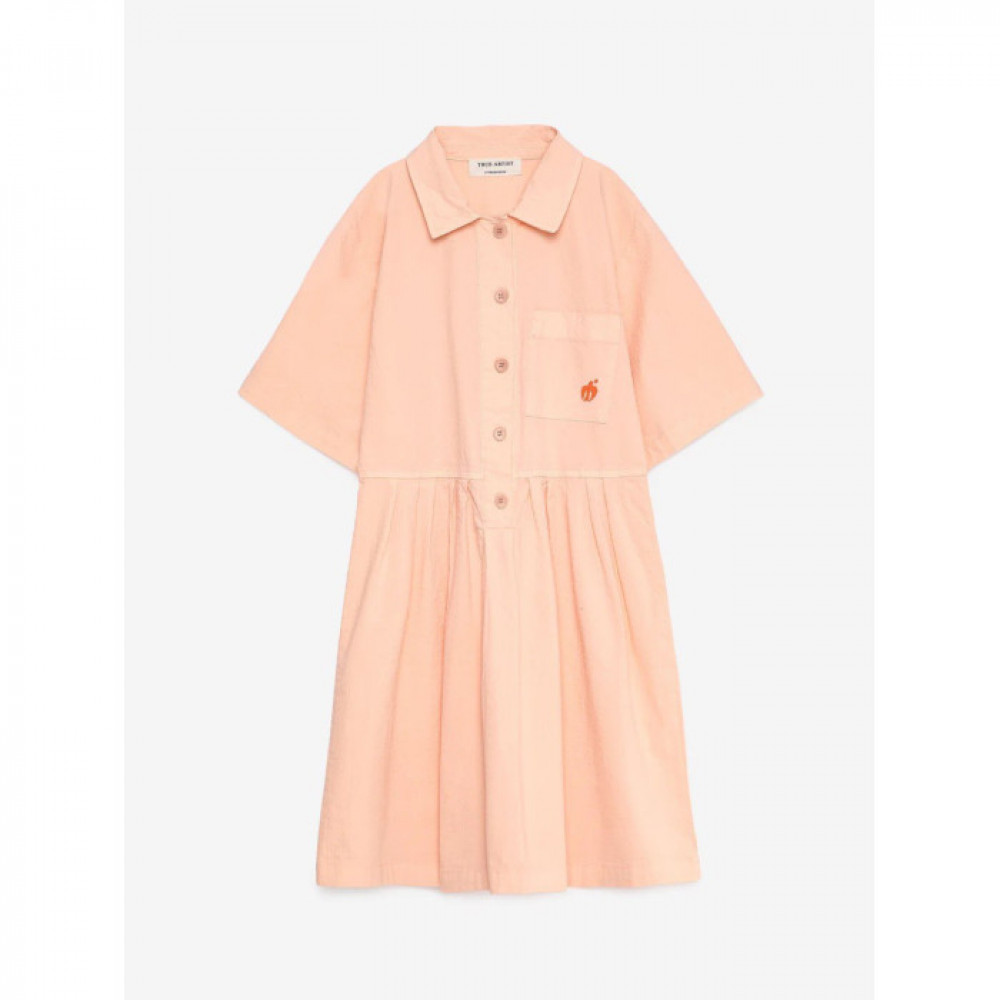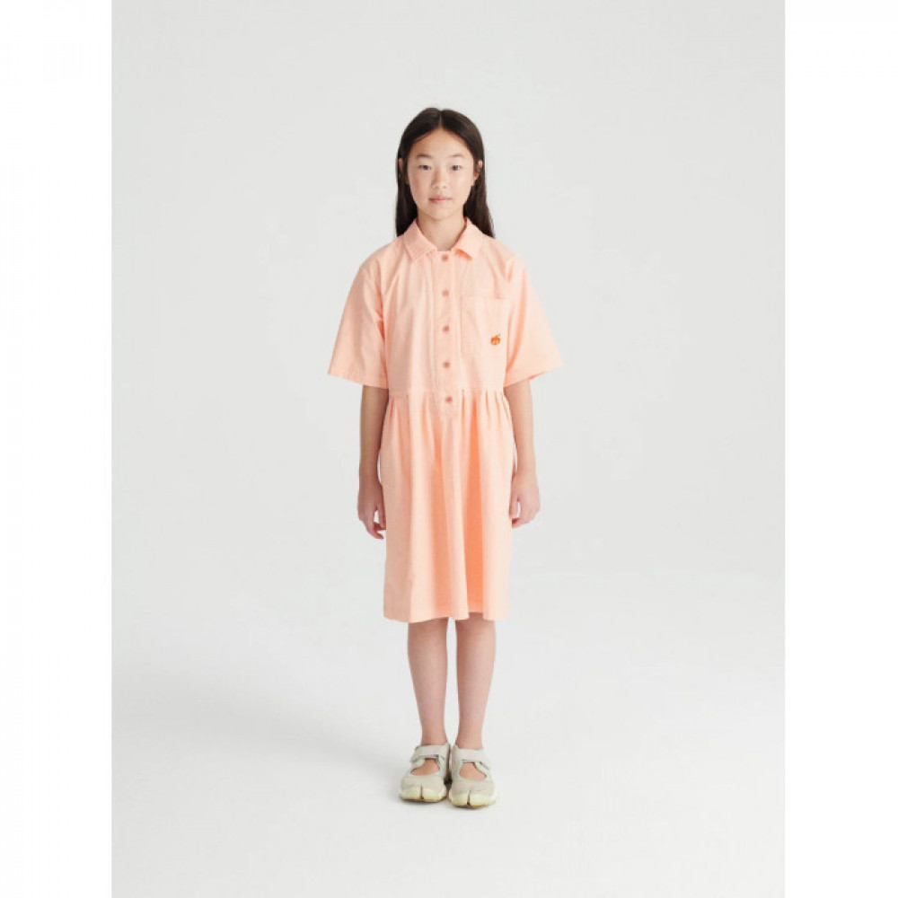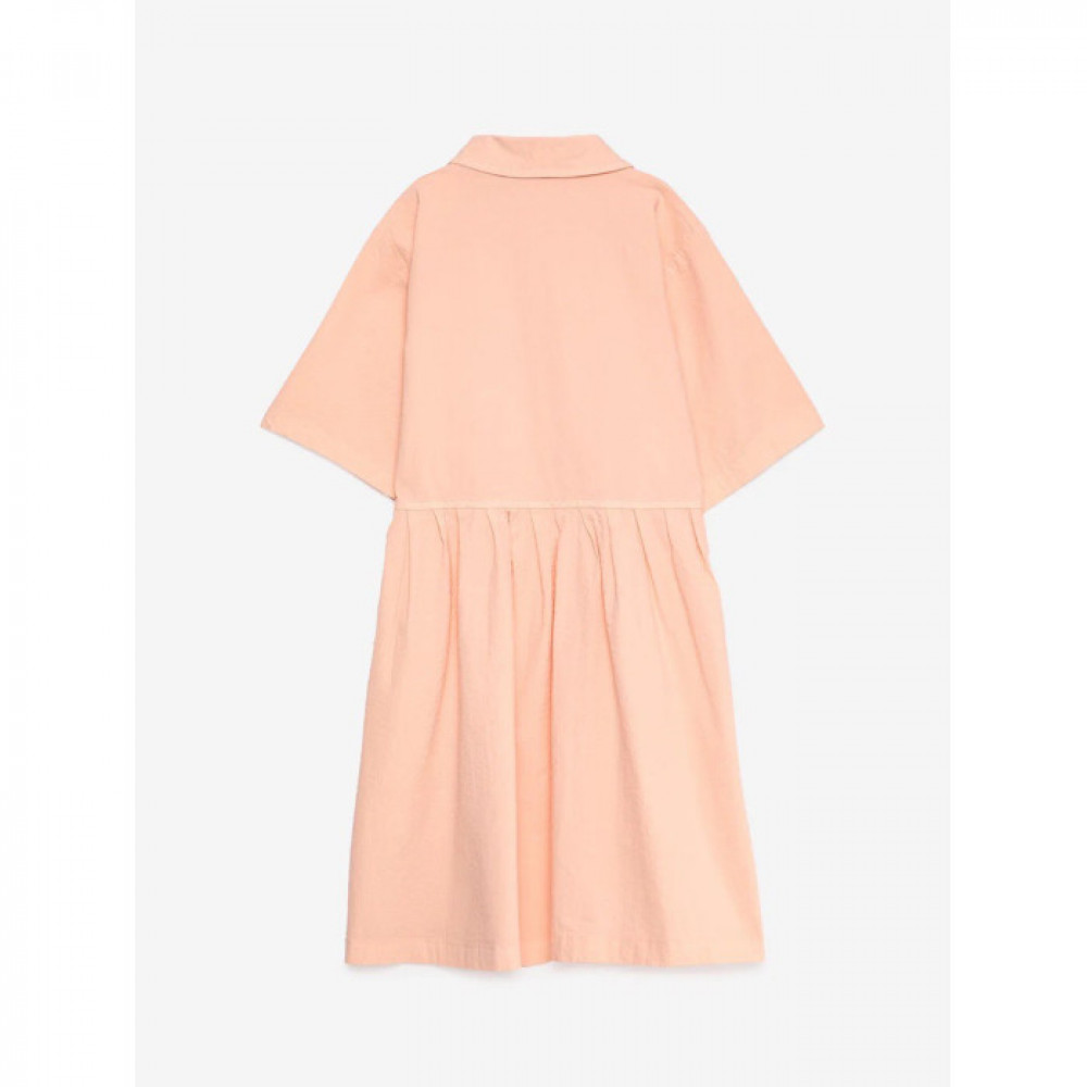 This textured short sleeve dress is designed with spread collar, front button fastening and a chest patch pocket with our bird logo embroidered in contrast color. This midi dress has an evasé fit. Made in Spain.