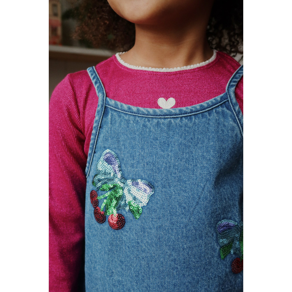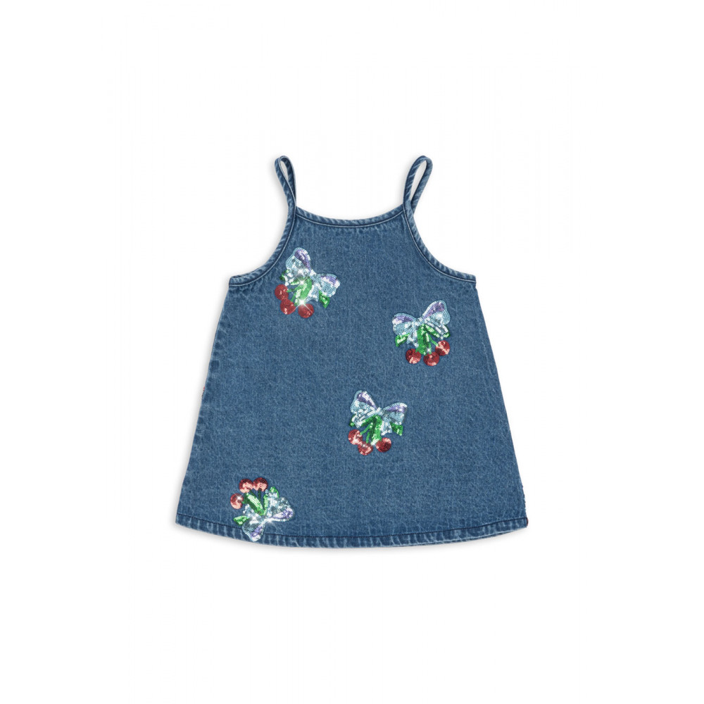 Denim strap dress with embroidered sequin cherry bows. Crafted from 100% organic cotton Washing instructions: Please wash product separately, as it may bleed colour.