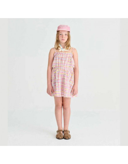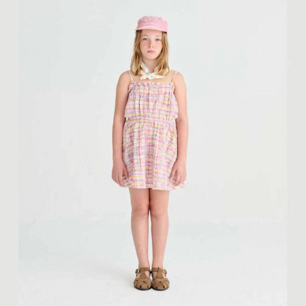 Nomadic Pink Dress is made of 99% cotton and 1% elastane textured fabric. This colorful all over printed dress is designed with adjustable straps and elastic on waist. It has an evasé fit and its length is over the knee. Made in Spain.