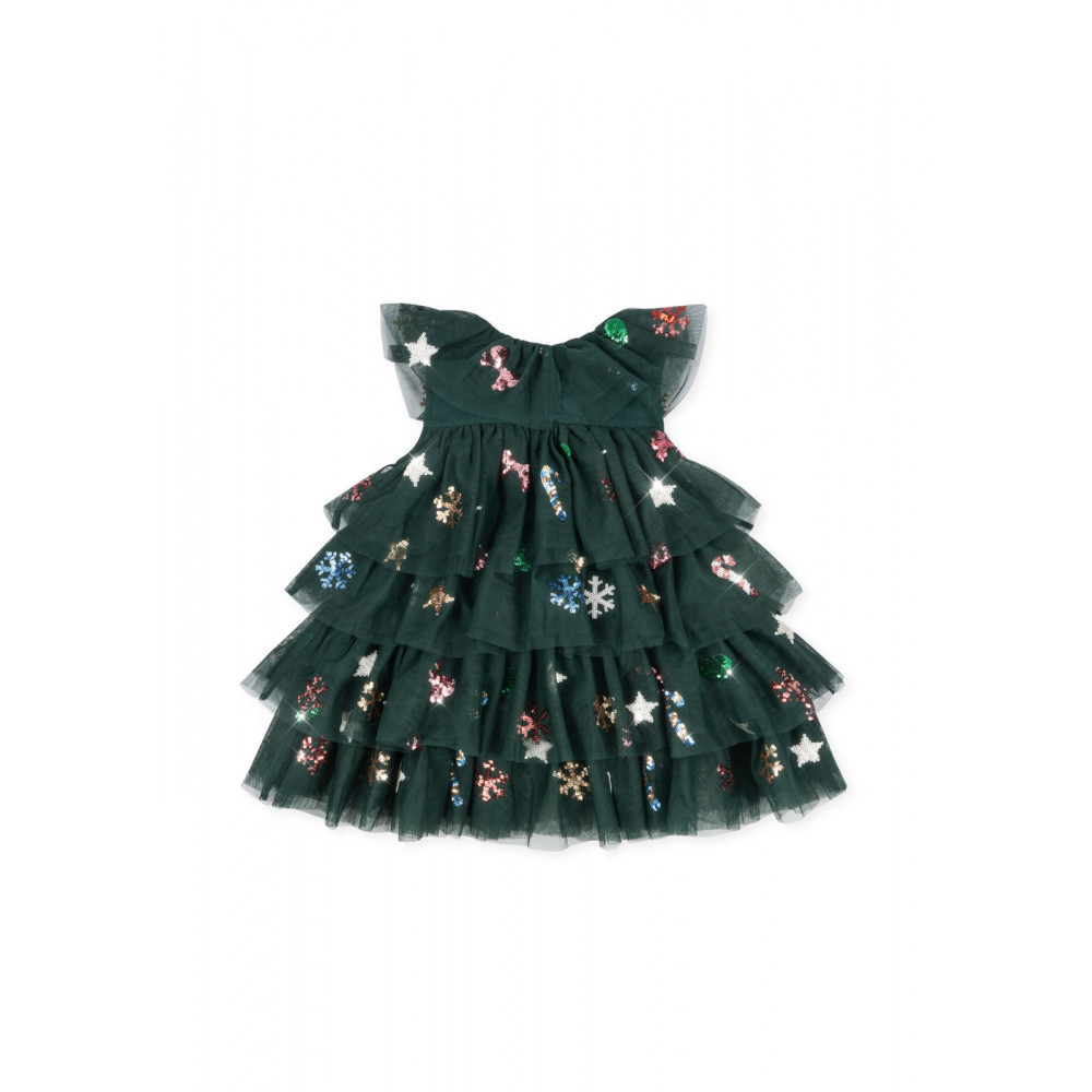 Festive tulle dress adorned with holiday themed sequin attachements. Designed with a voluminous skirt and soft layers of tulle all over. Lined with soft cotton.