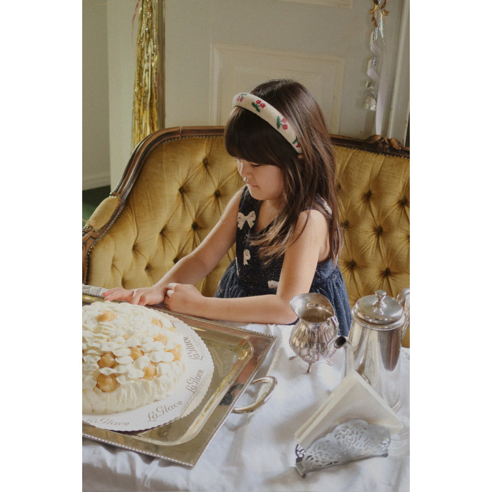 Tulle dress with sequin bows and all-over shimmer effect. Designed with a soft cotton lining and a voluminous skirt. Closes at the neck with a single mother of pearl button.