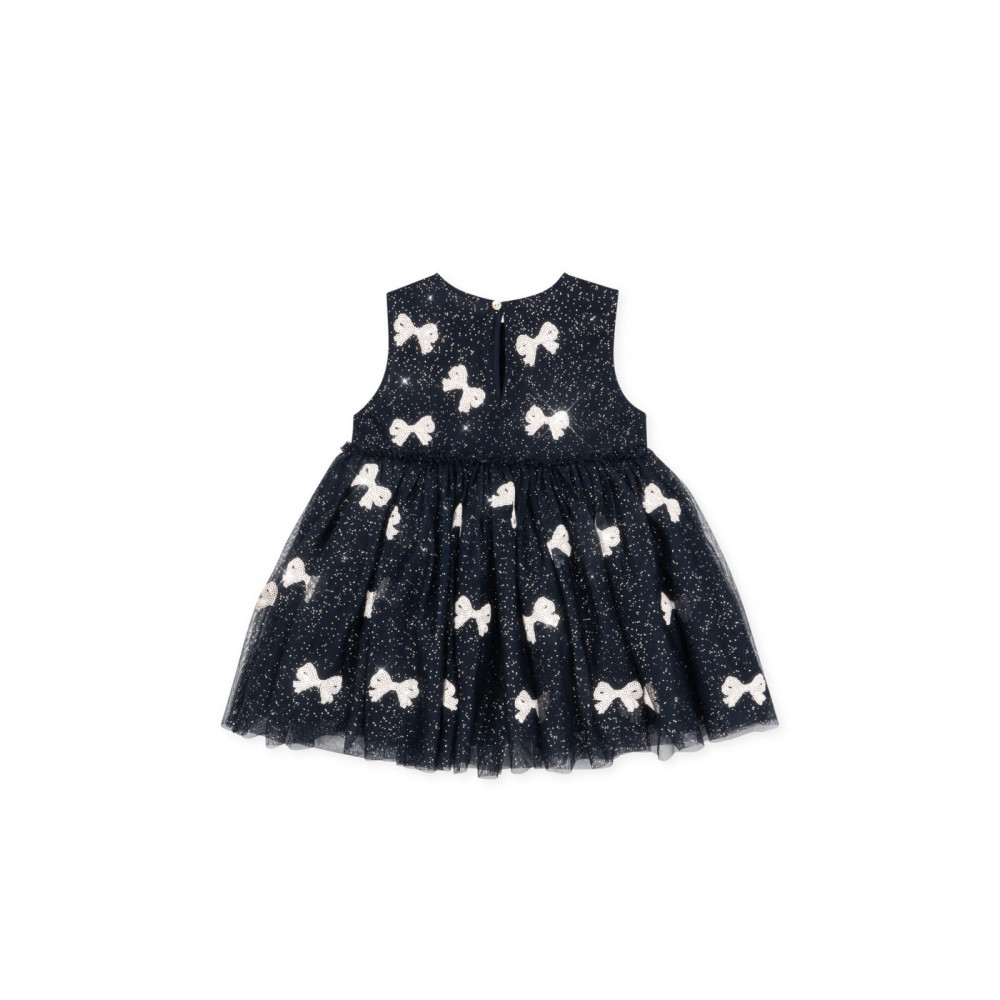 Tulle dress with sequin bows and all-over shimmer effect. Designed with a soft cotton lining and a voluminous skirt. Closes at the neck with a single mother of pearl button.