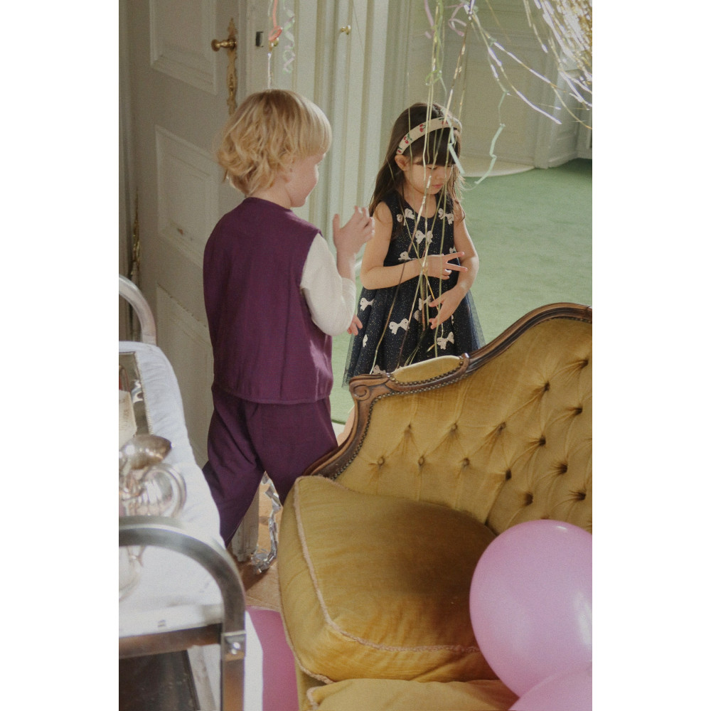 Tulle dress with sequin bows and all-over shimmer effect. Designed with a soft cotton lining and a voluminous skirt. Closes at the neck with a single mother of pearl button.