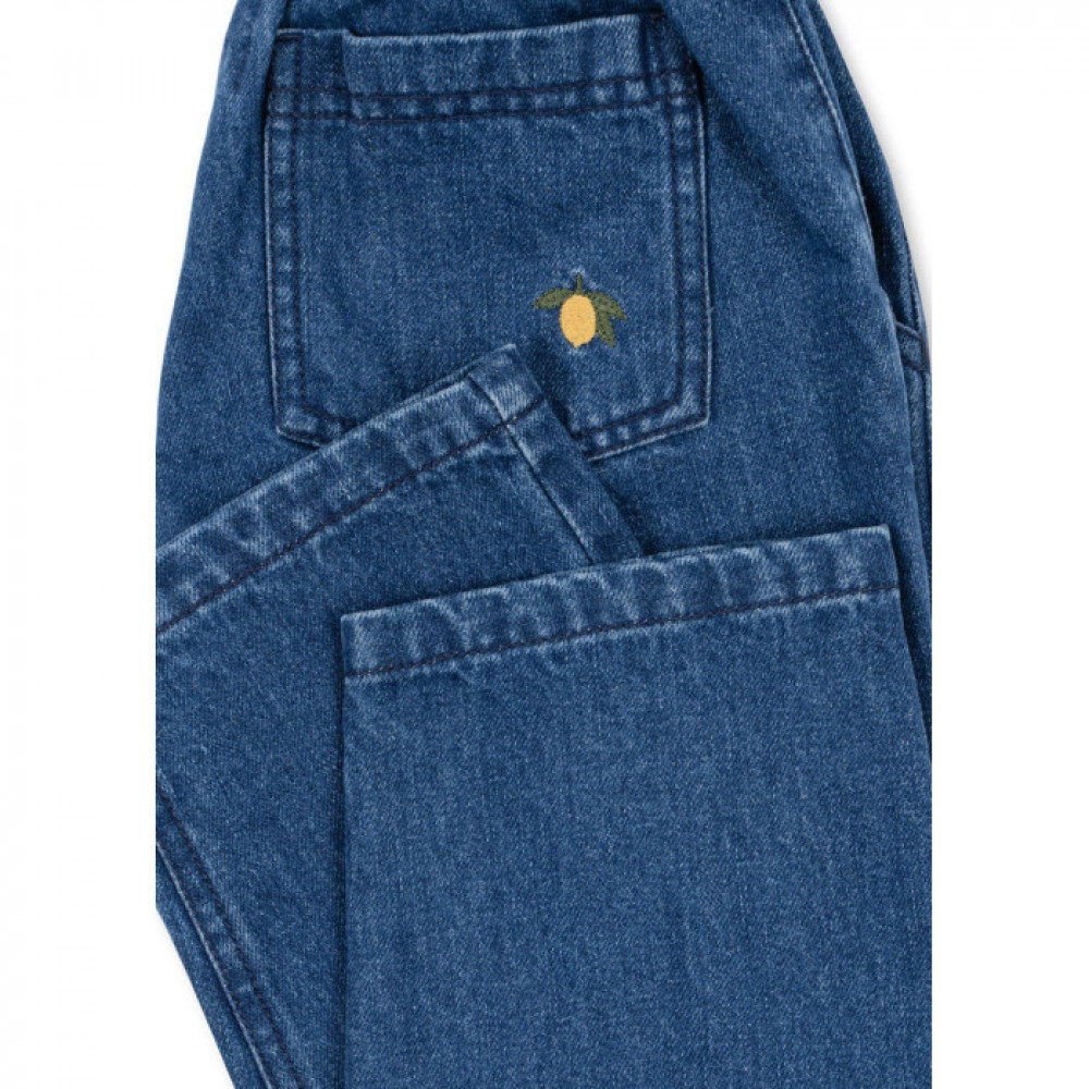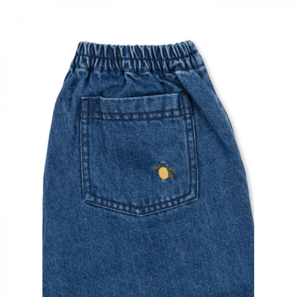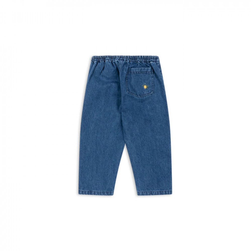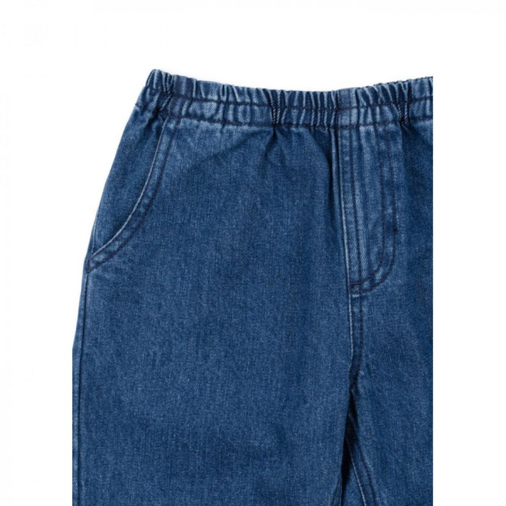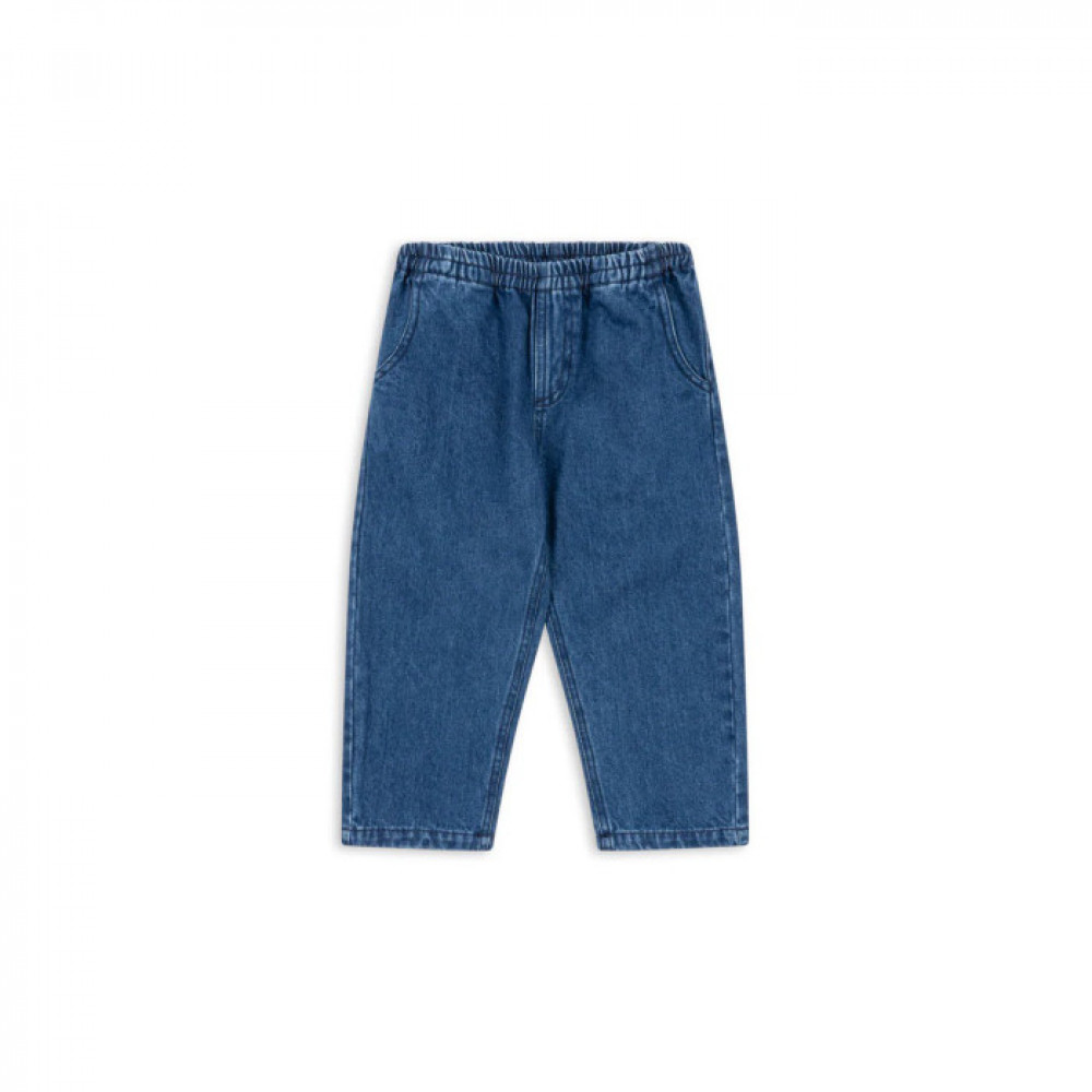 Soft denim pants with an elastic waist. Washing instructions: Please wash product separately, as it may bleed colour.