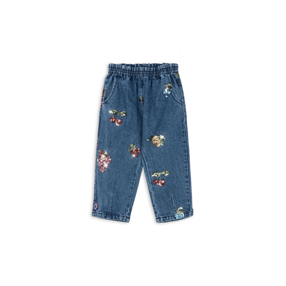 Soft pants in a durable denim quality. Designed with embroidered sequin fruits, a straight fit, and a comfortable elastic waistband.