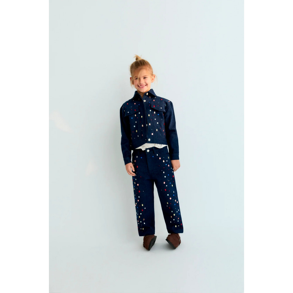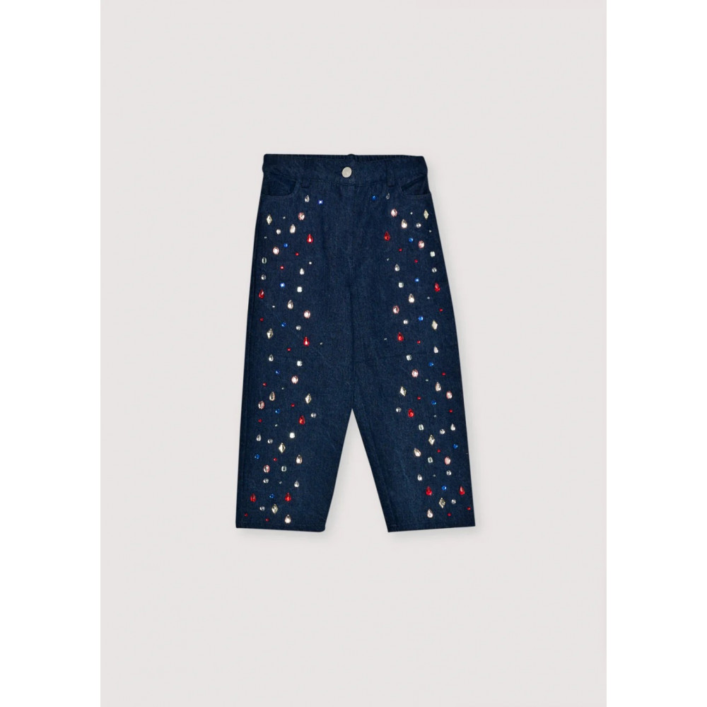Dark denim pants featuring hand-applied multicolor crystal details on the front for a subtle sparkle. Finished with TNS embroidery in lurex, they pair perfectly with the matching jacket to create a coordinated, stylish look.