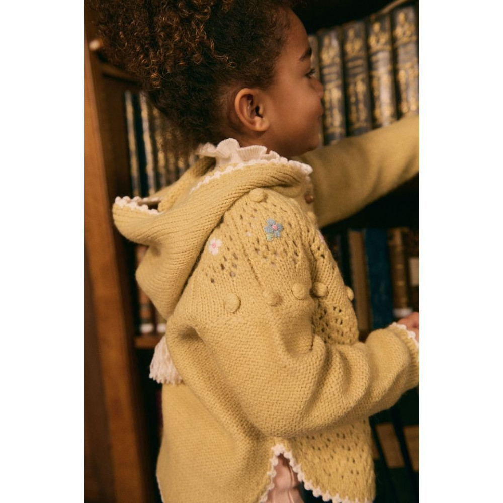 A beautifully crafted honey mustard knit cape designed with attention to detail. This piece features a soft cream knit trim, delicate pink, cream, and pale blue knit floral accents, cozy hood, and classic wooden toggle closures. Ideal for layering, it offers both warmth and style for special occasions or everyday wear. Wash delicate cycle. Do not bleach. Do not tumble dry. Do not iron. Dry cleaning allowed.