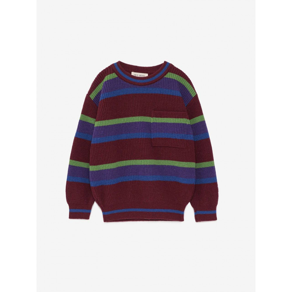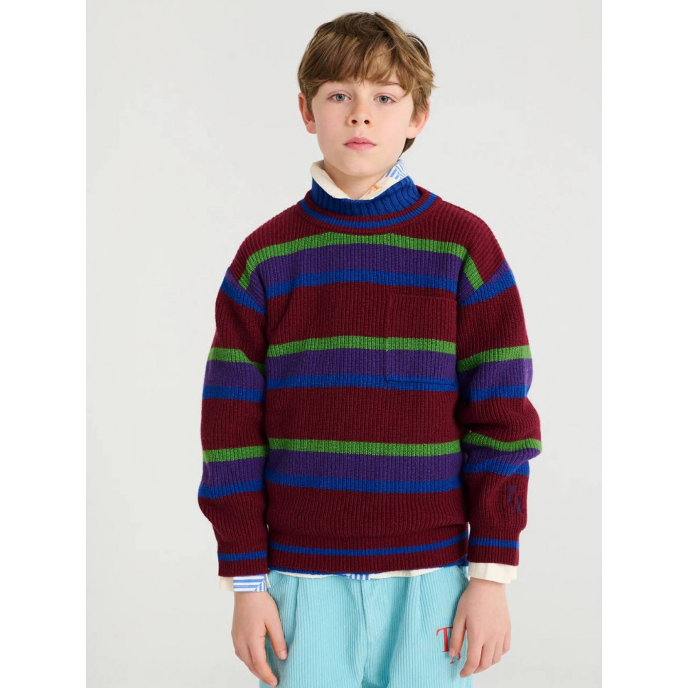 Jumper nº05 in Autumn Fig is made of 10% cashmere, 30% wool, 30% polyamide and 30% viscose blended thread. This knitted crew-neck sweater features a vibrant horizontal irregular stripe pattern. The sweater has a relaxed fit with ribbed cuffs and hem, and a small, functional patch pocket is subtly integrated into the stripe pattern on the left chest. Made in Spain.