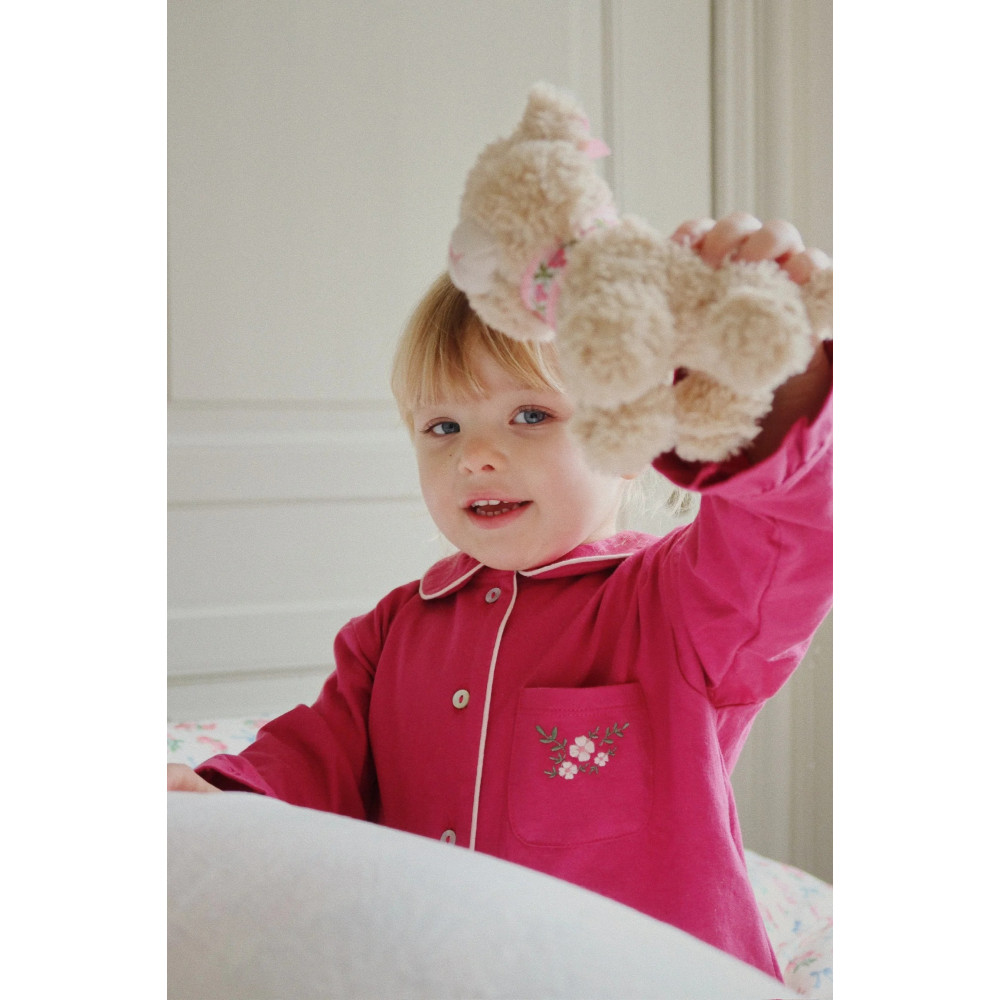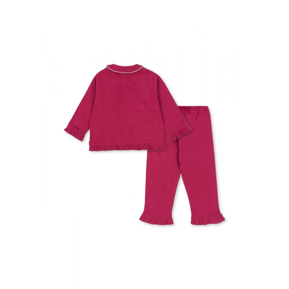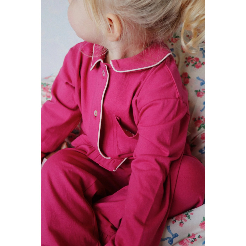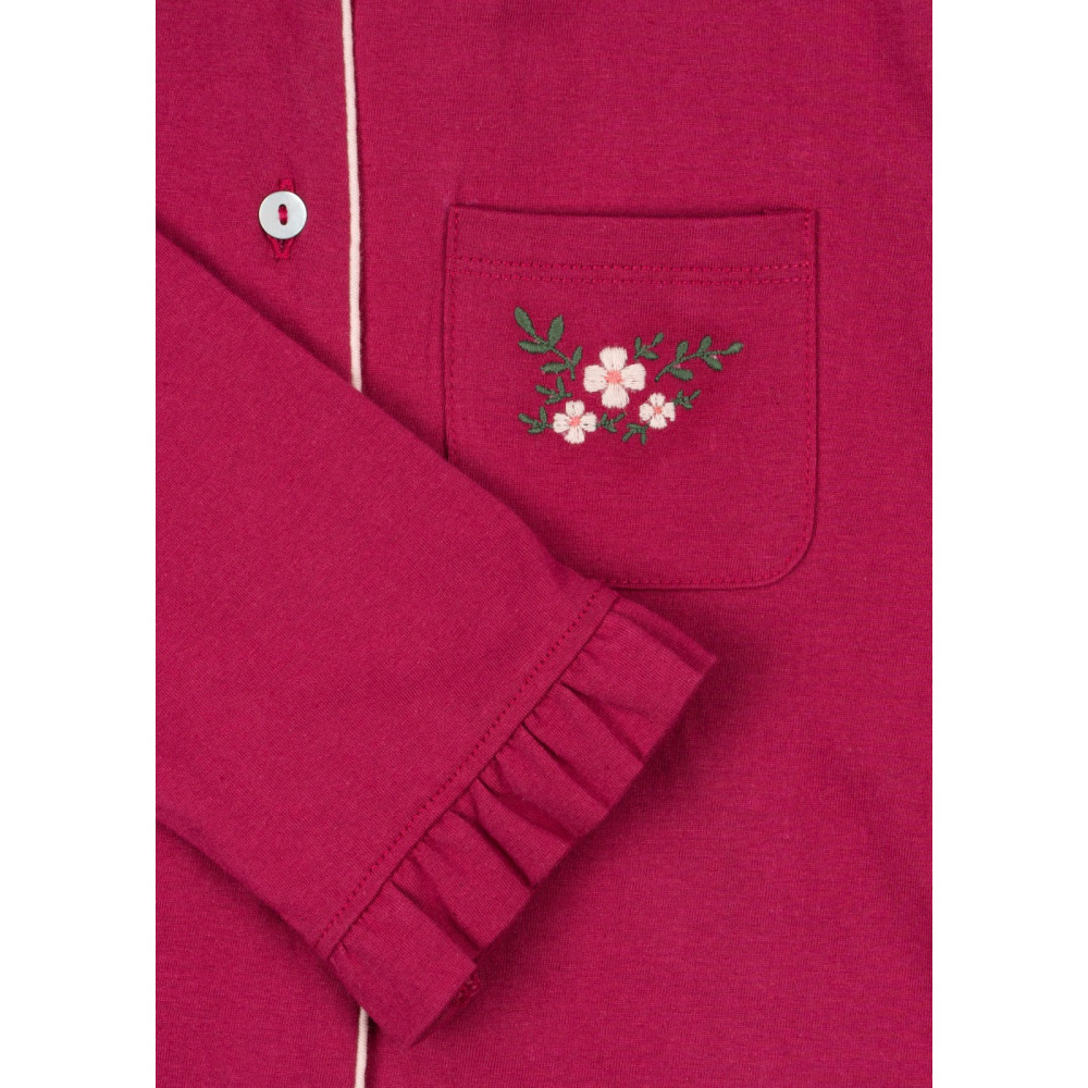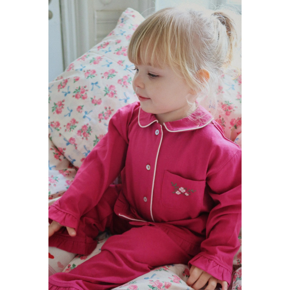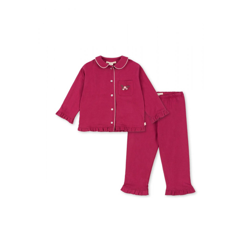 Soft jersey set made for slow and comfy days at home. The set includes a classic pyjama shirt and soft pants with frill detailing.