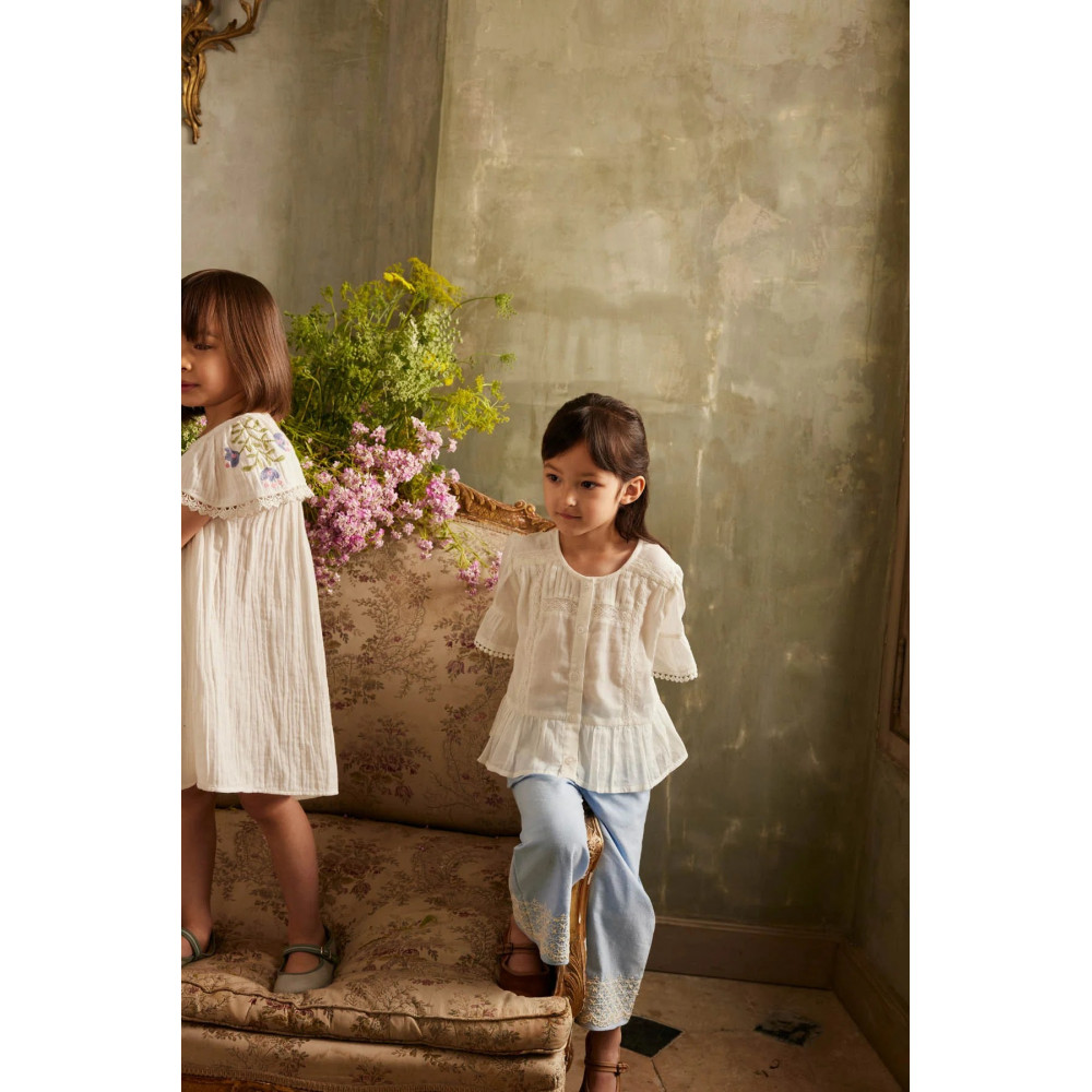 Solid color blouse in cotton veil. Buttoned at front from top to bottom. Pleated details on the front yoke with lace inlay at the front. Ruffled sleeves with dot lace trim and ruffles at the bottom.