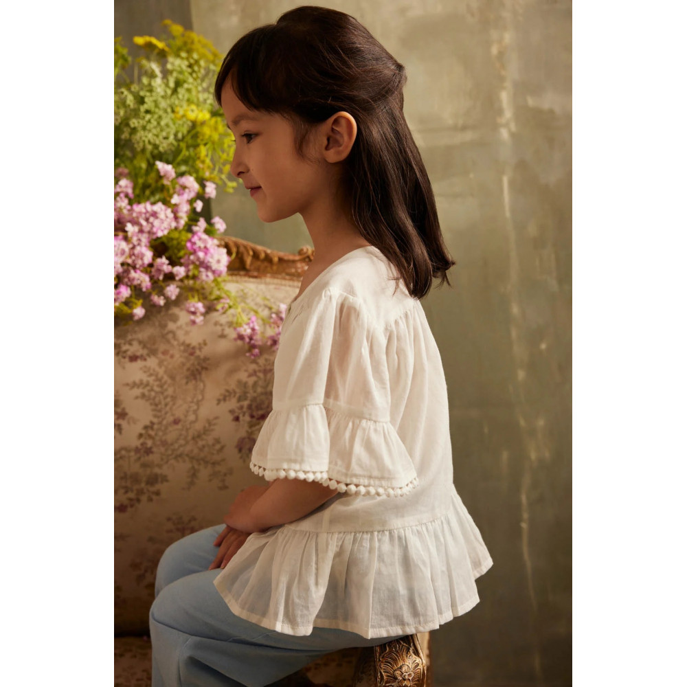 Solid color blouse in cotton veil. Buttoned at front from top to bottom. Pleated details on the front yoke with lace inlay at the front. Ruffled sleeves with dot lace trim and ruffles at the bottom.
