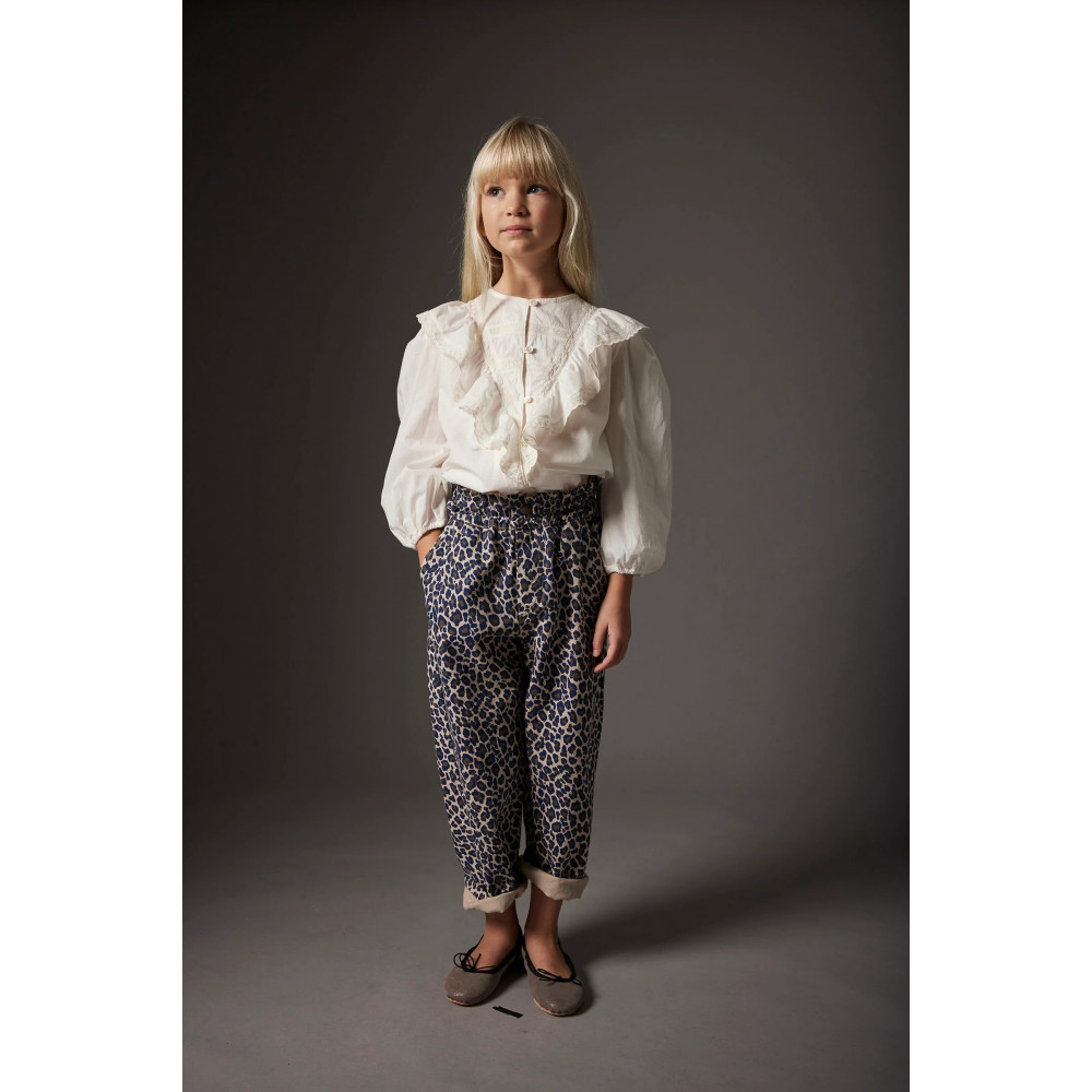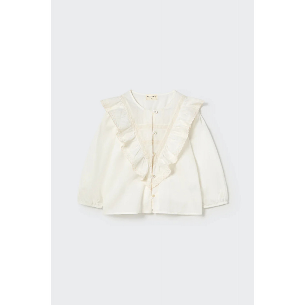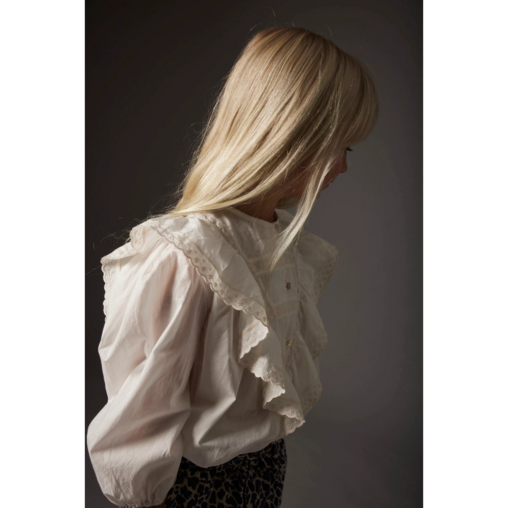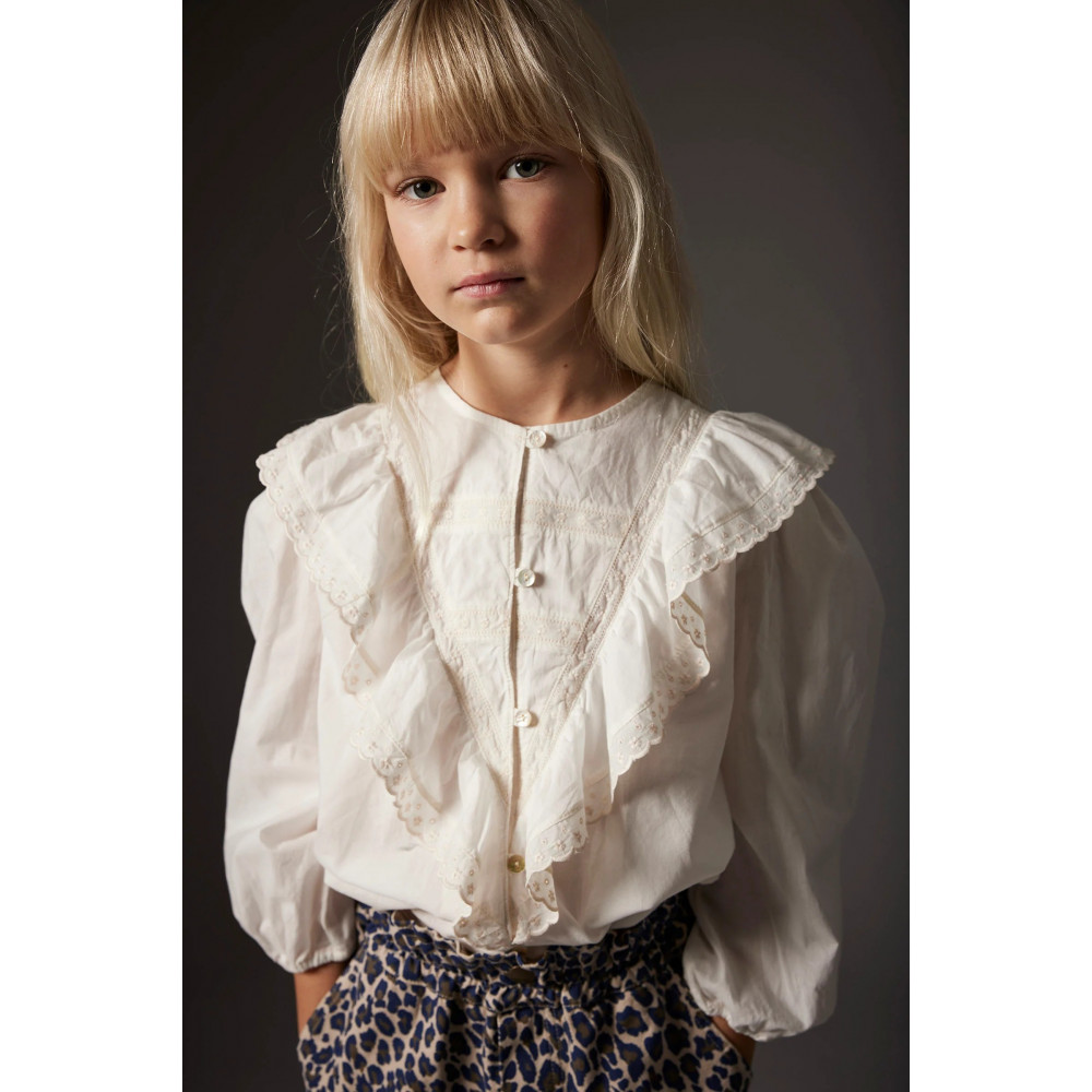 This girls' blouse is crafted from delicate, natural woven cotton voile with a soft, romantic feel. Made from GOTS-certified organic cotton, it features a round neckline with a mother-of-pearl button closure at the front. A V-shaped yoke at the front and a square yoke at the back are both finished with fine lace detailing. Ruffles with lace trim frame the front yoke, while long puffed sleeves with elasticized cuffs complete this timeless silhouette. Lightweight, breathable, and gentle on the skin. Made from GOTS-certified organic cotton. Lightweight and breathable for airy comfort. Soft texture with a romantic, timeless feel. Gentle on the skin and the planet. A sustainable choice for your girl’s wardrobe.