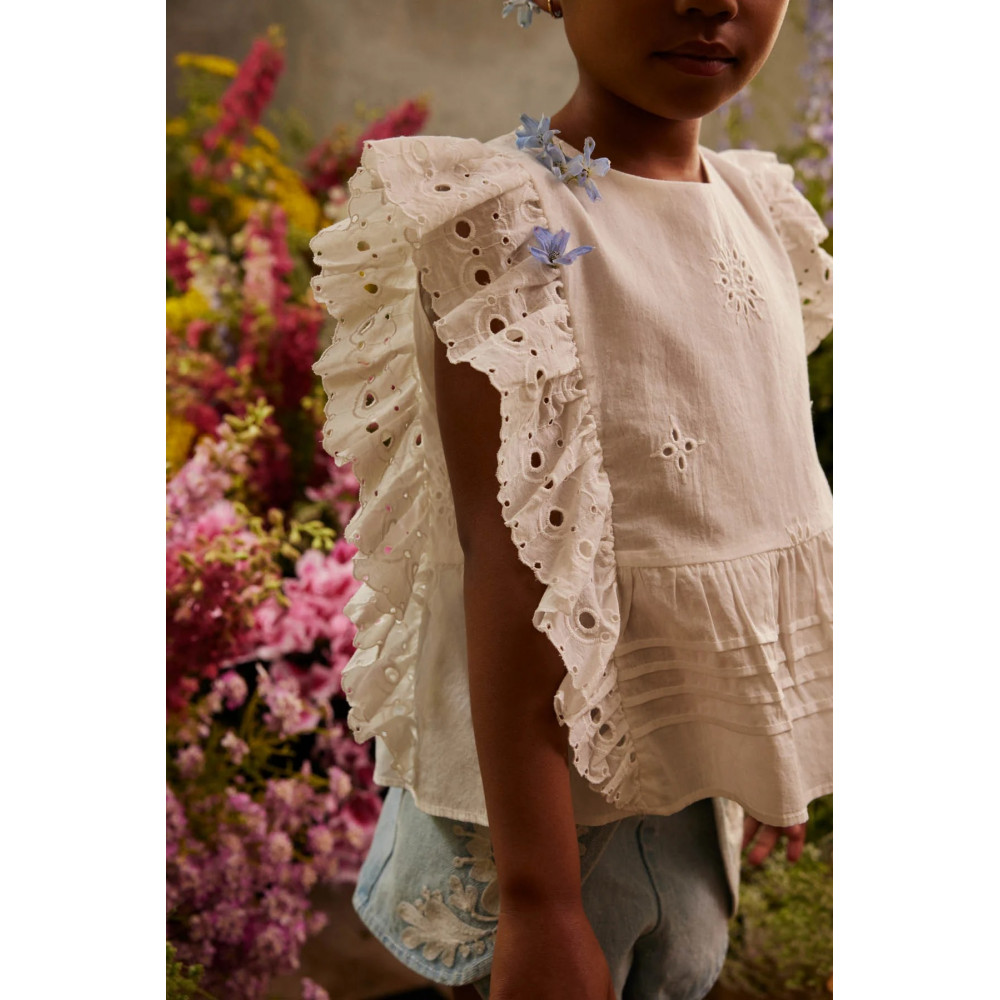 This charming white blouse features delicate eyelet details and playful ruffles that twirl with every move. Crafted from 100% organic cotton with beautiful schiffli embroidery, it's soft against skin and kind to the planet. Perfect for pairing with the Asya Shorts for an effortlessly sweet look that lets her personality shine through.